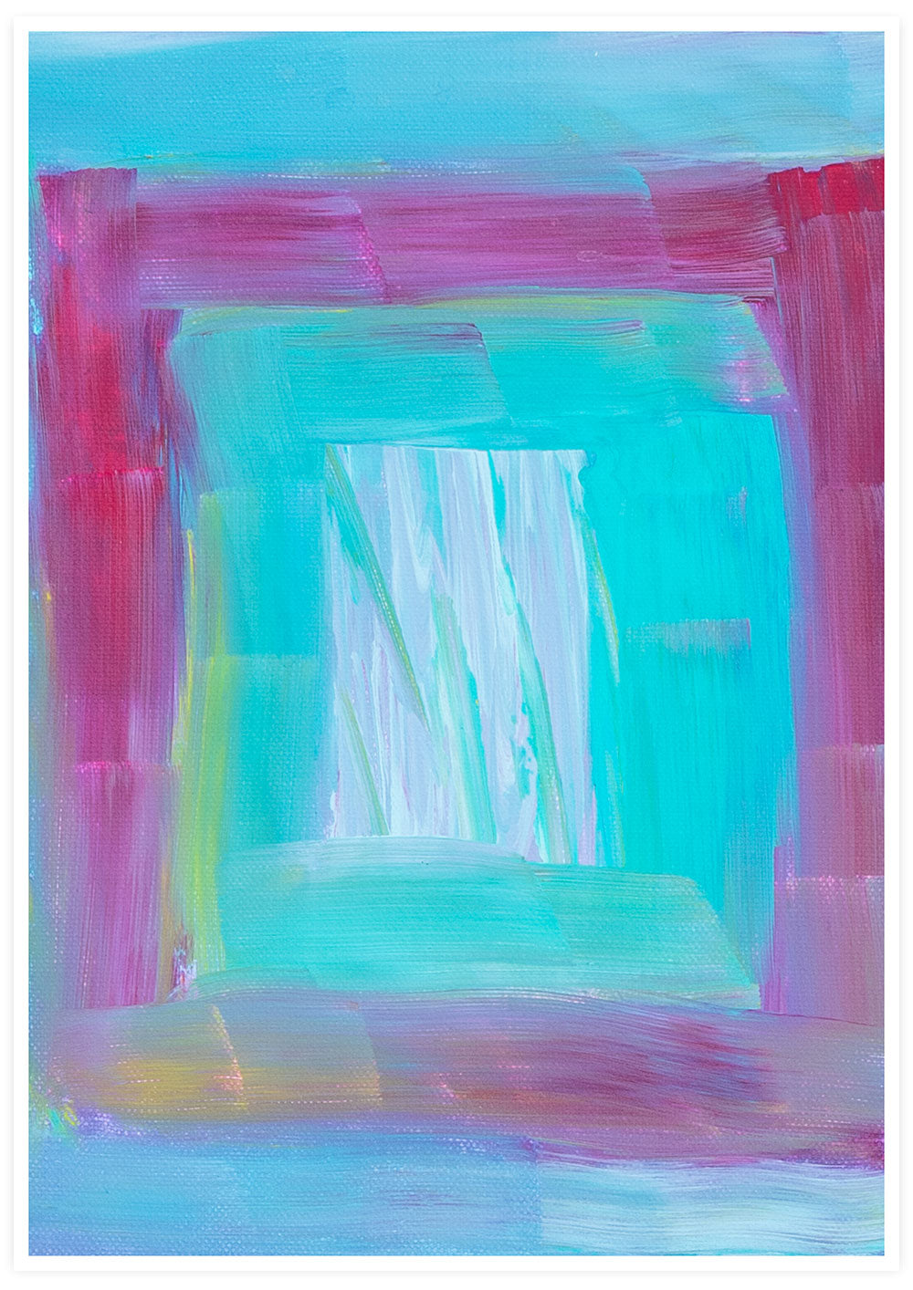 In full panic this person needs a way out, confused but still sane they battle their anxious surroundings to a more peaceful cooling reservoir of green within a small box of relaxing lavender tones occupying the centre of the canvas. Their safe place. Now calm once again."
