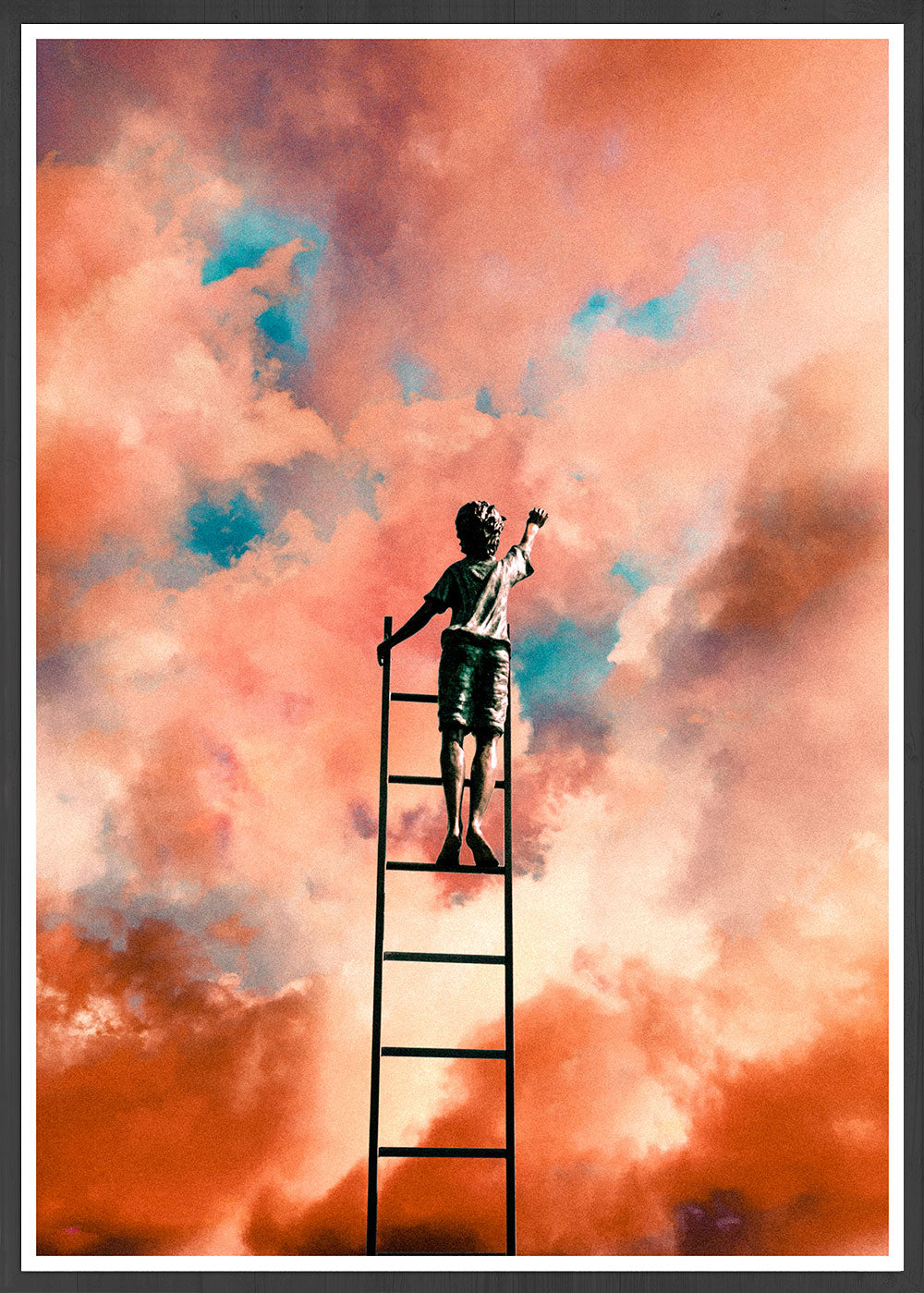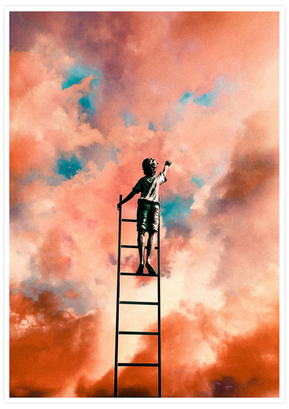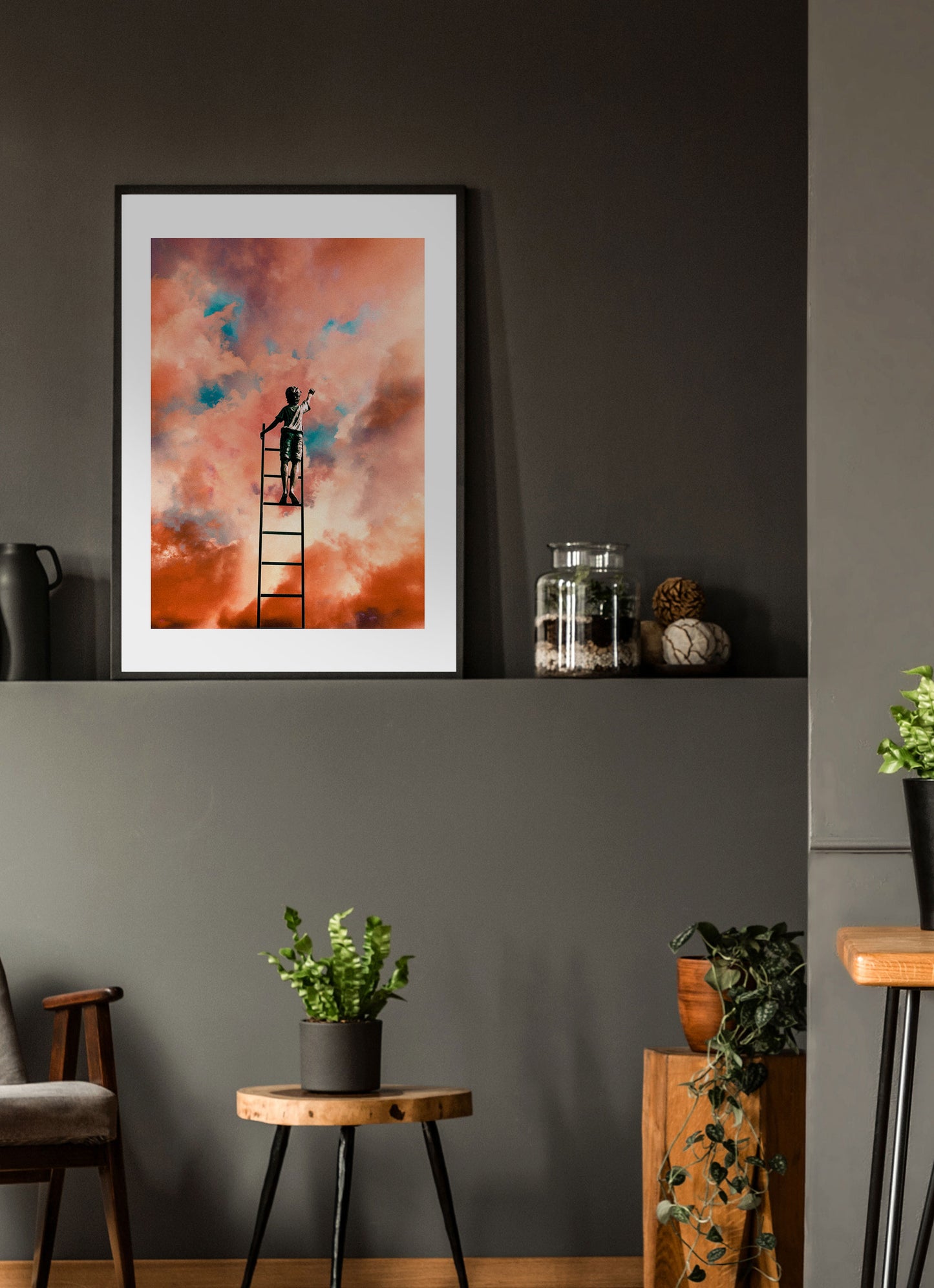 "Cloud Painting" by Taudalpoi is a captivating artwork that captures the boundless imagination and adventurous spirit of a child. The image depicts a vibrant peach-colored sky, a vast expanse waiting to be transformed. Atop a sturdy wooden ladder, a determined child reaches for the sky, brush in hand, ready to leave their mark on this dreamy canvas.