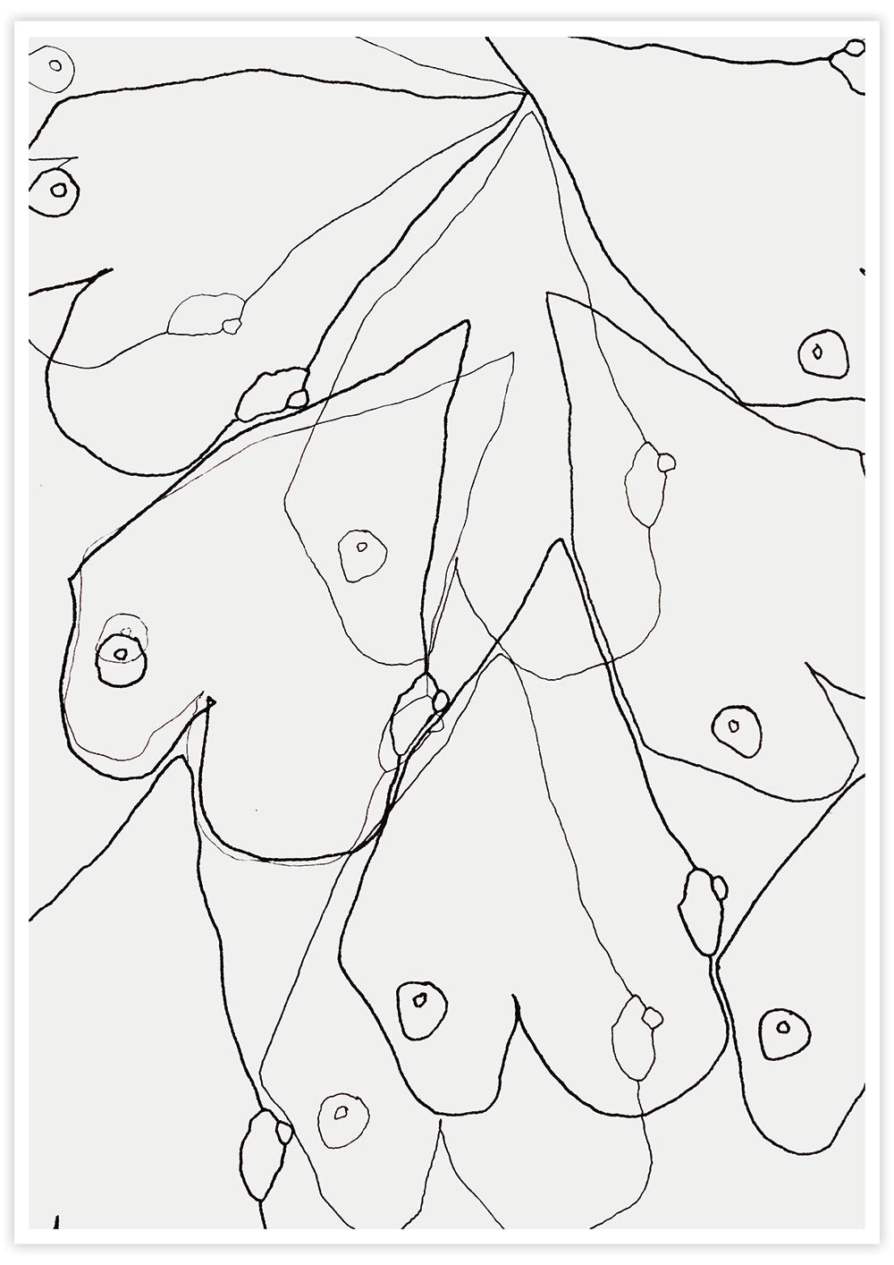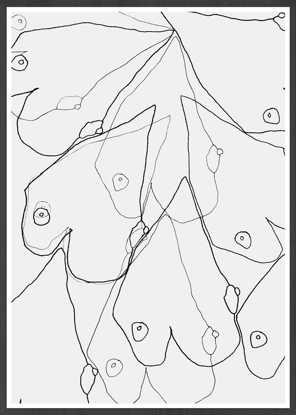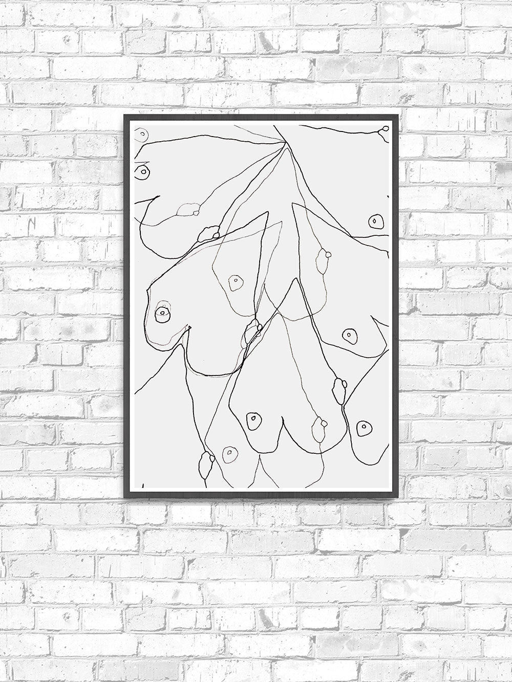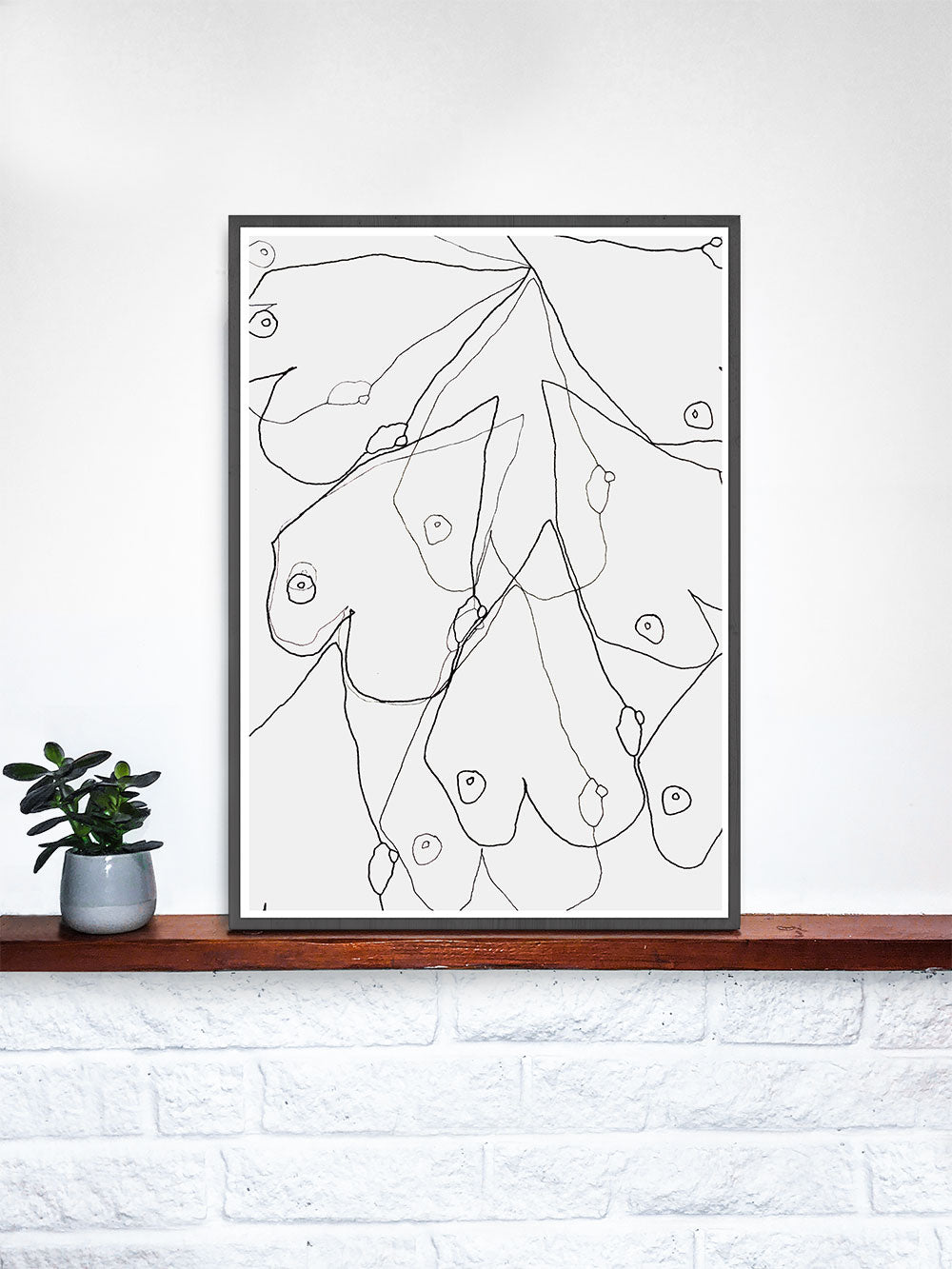 'Tits Up'  Its all gone tits up.  Hand Drawn Illustration in Black and White.  Illustration Print by Alexandra Levene.
