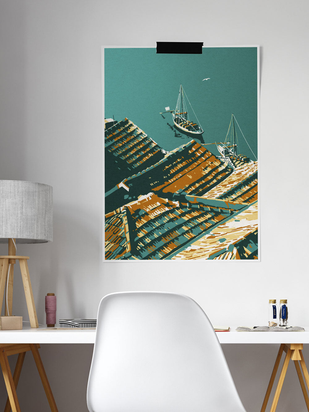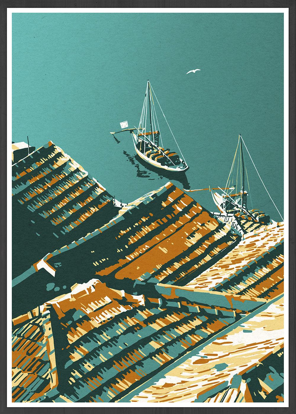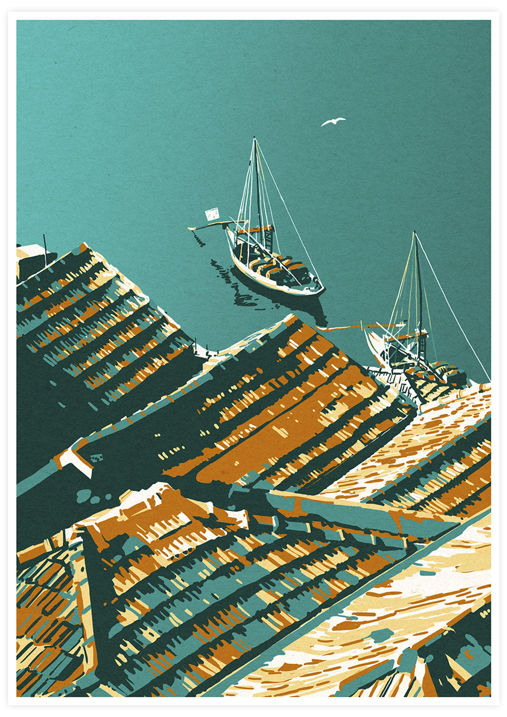 Cais de Gaia Boat Illustration by Camila Nogueira. The traditional Rabelo boat that was used to transport the port wine between the Douro valley and the city of Porto.
