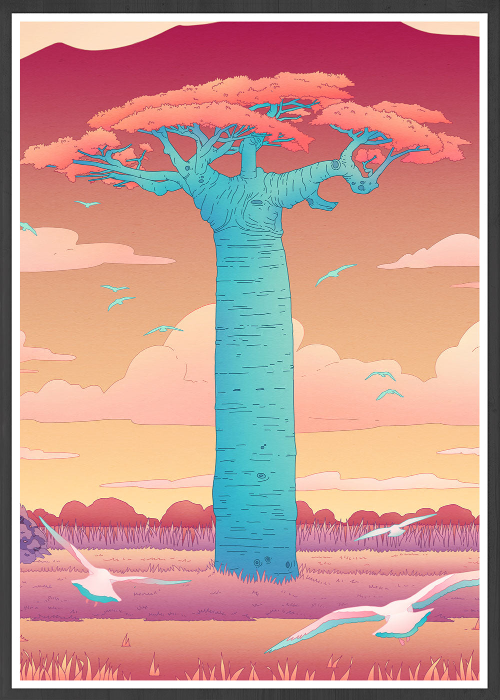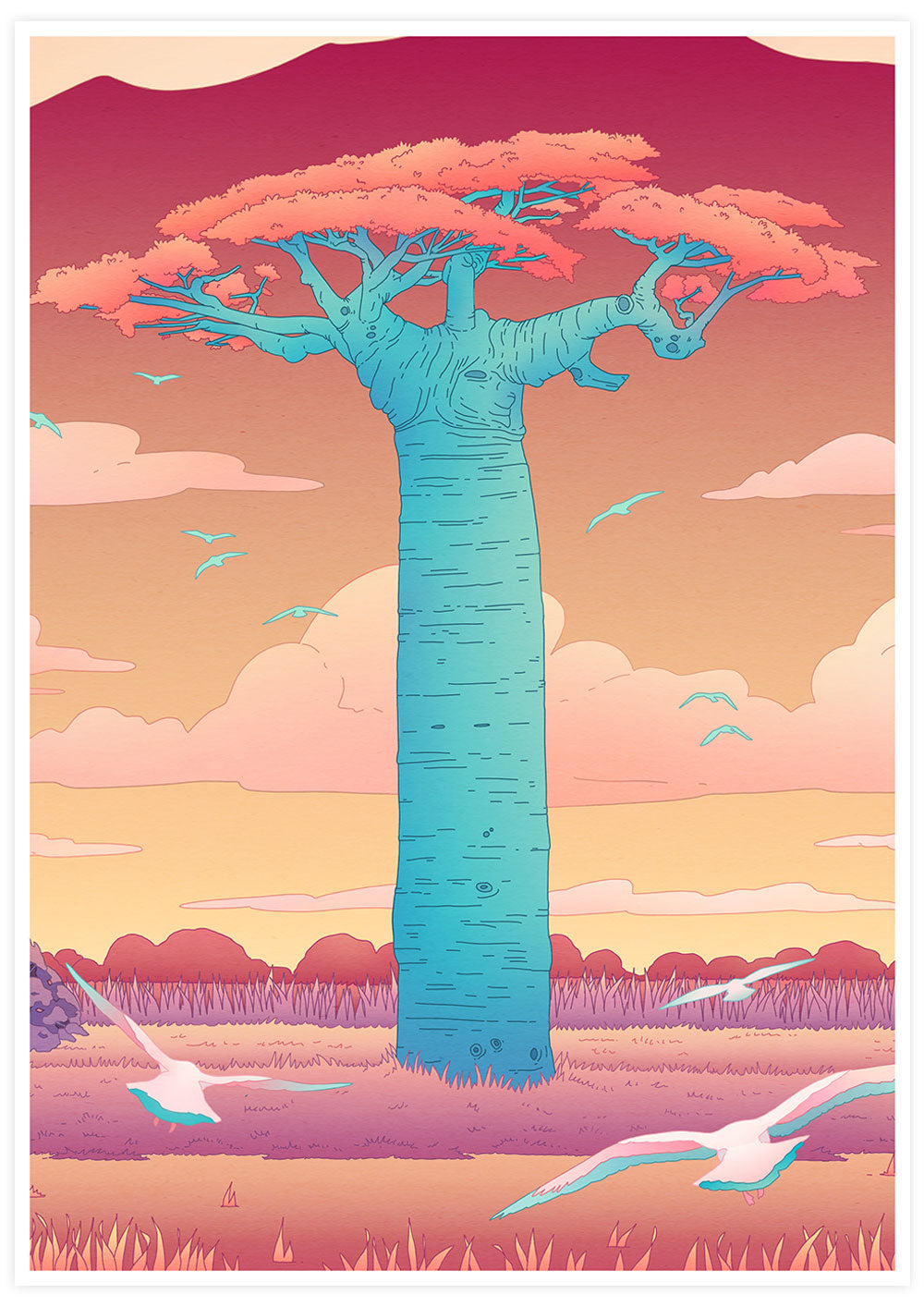 Grandidiers Baobab Tree Art by Camila Nogueira. Grandidiers baobab is the biggest and most famous of Madagascar's six species of baobabs. This imposing and unusual tree is endemic to the island of Madagascar, where it is an endangered species threatened by the encroachment of agricultural land.