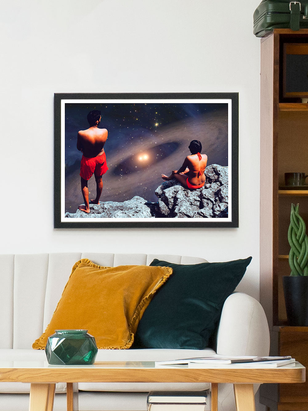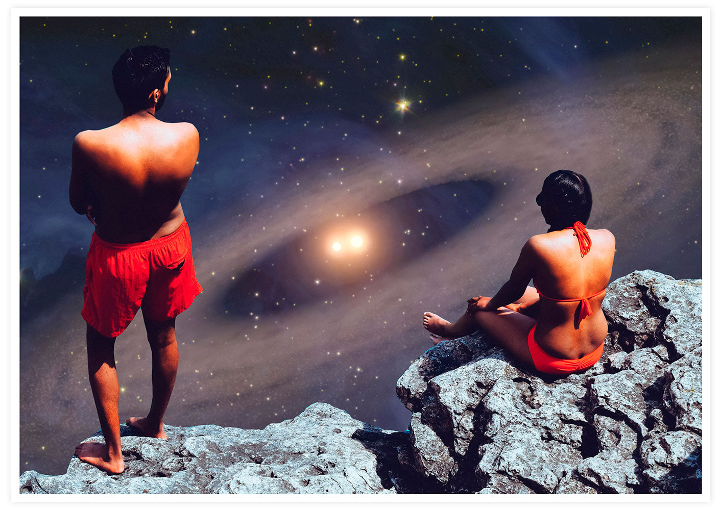 Digital collage of a couple starring at some galaxy Set your mind in adventure mode. Feel that feeling that only appears that moment just before going on holiday.