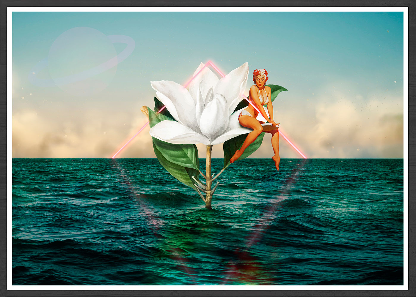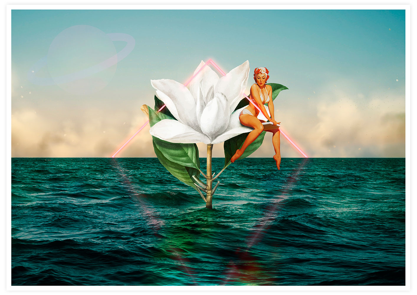 Digital collage of a woman on her bathing suit sited on a flower over the sea, with Saturn behind clouds looking the scene. This title is inspired by a song by the Uruguayan artist Jorge Drexler, I really recommend his music. I don't know what issue I have with Saturn.
