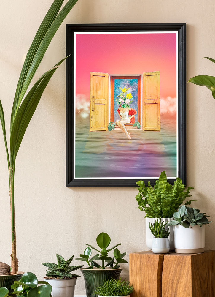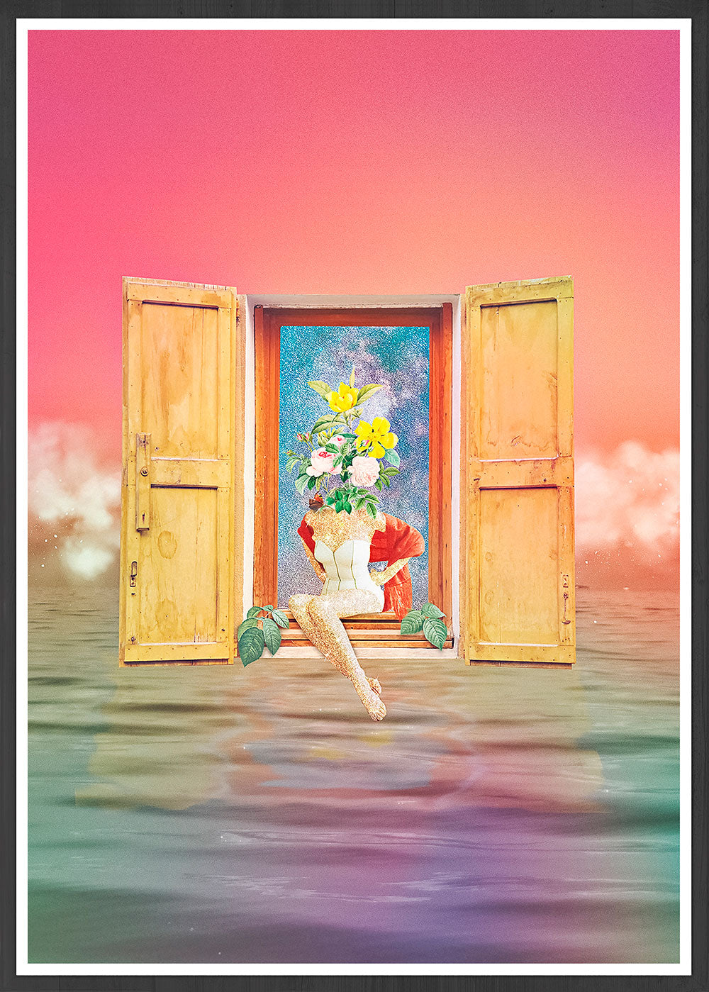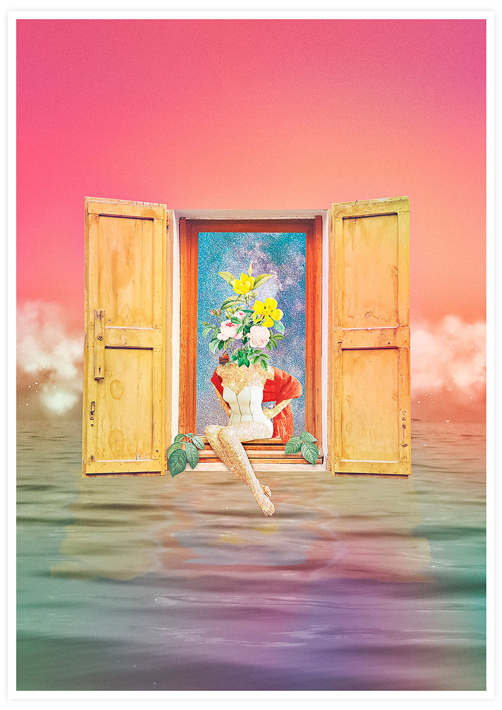 Digital collage of a shiny skin woman sitting in the window over a sea. Transmits that feeling of being relaxed enjoying a moment alone with yourself, appreciating what surrounds you. Who wouldn't want to be sitting in a window, with a flower head, a bright sky behind, and a glowing skin over a super calm sea of pastel colours in which you can swim anytime you want?