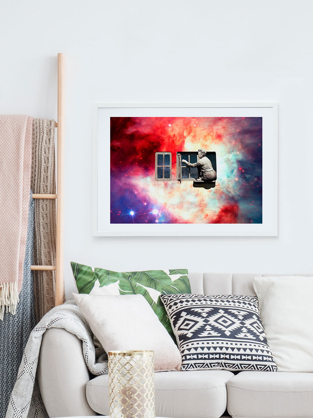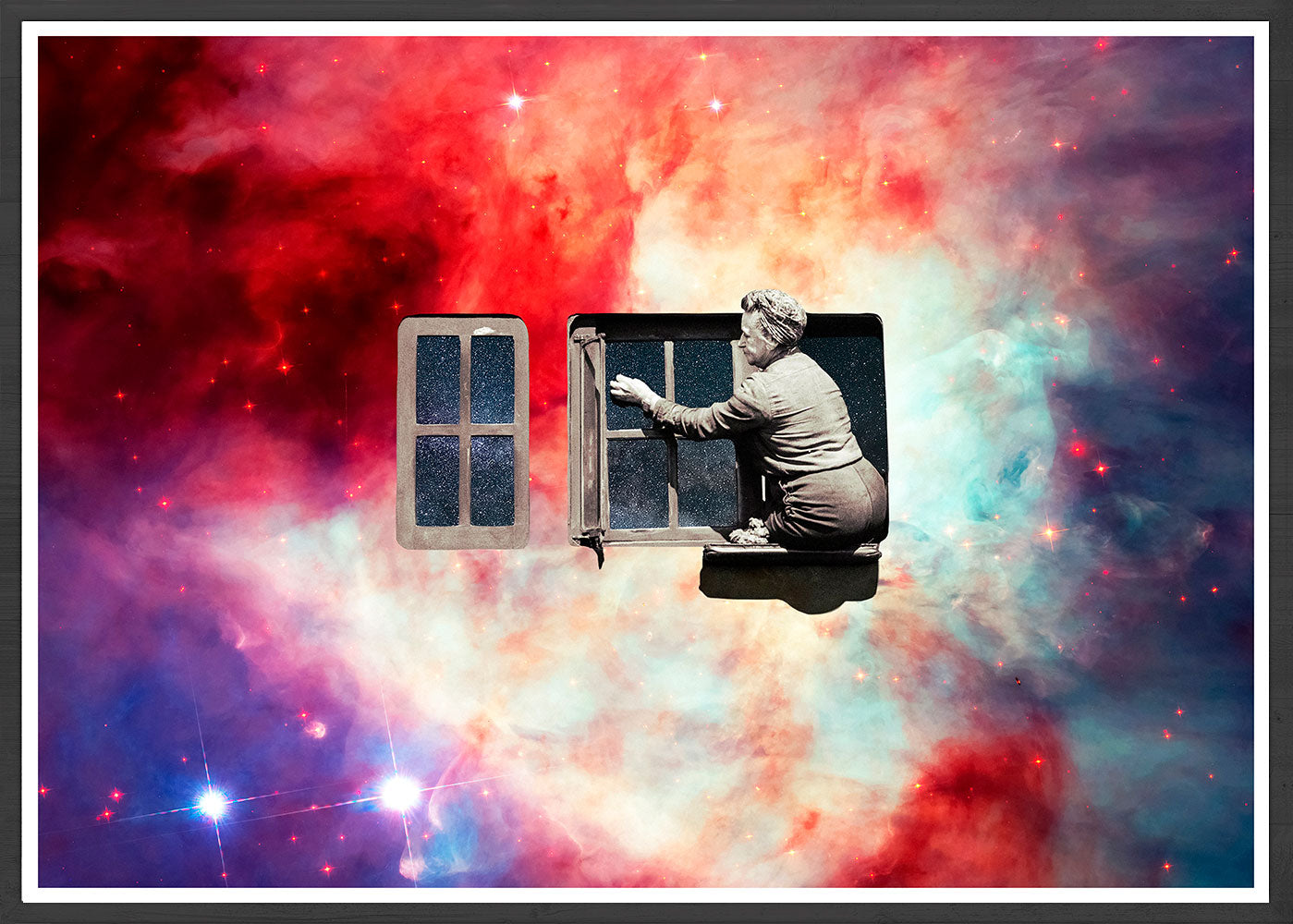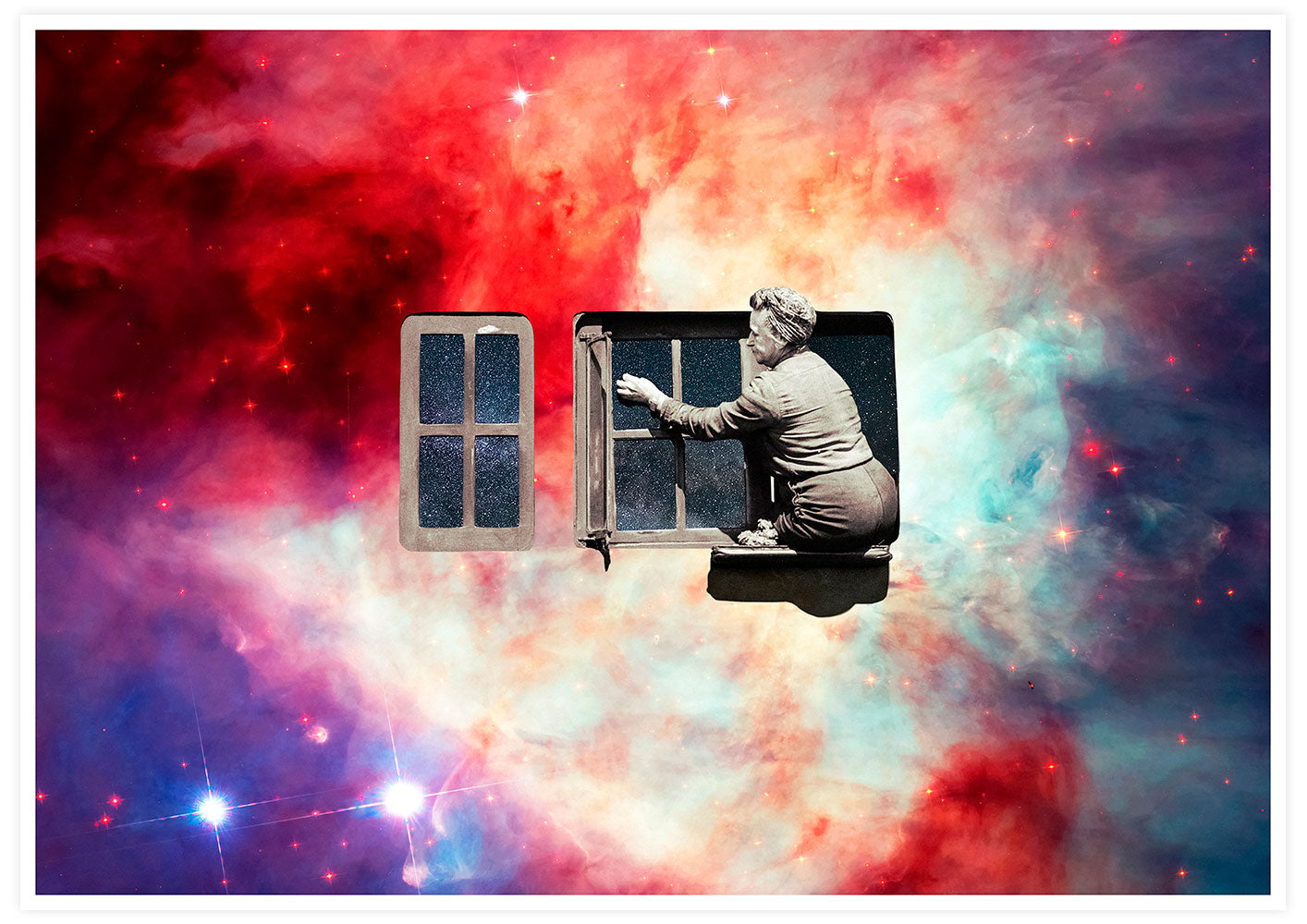 Digital collage of a woman sitting in a window of the universe. What color would your internal universe be? How many stars would it have? What would those stars mean to you? And if you had to open a window of your internal universe, where would you like it to give? It would definitely give me a bit of giddiness just sitting there, but I'd like to have the feeling anyway.