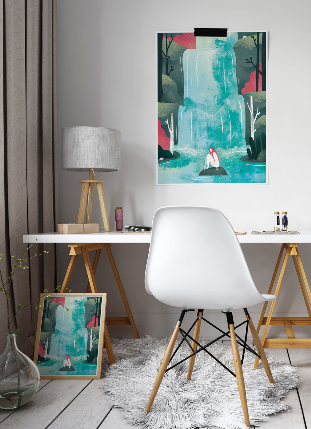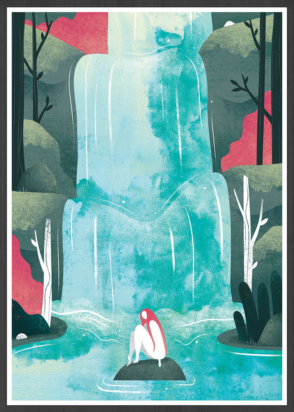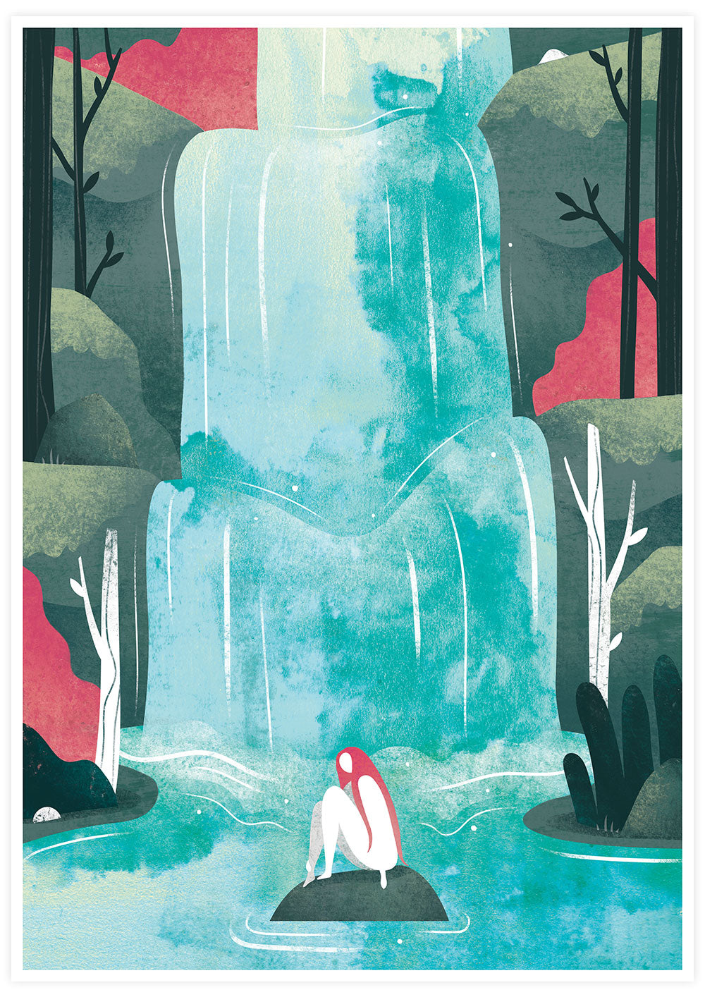 Waterfall Fantasy Print. Bring peaceful meditative vibes into your home with this digitally collaged print by Emily Dayson. Based on peaceful protest for female empowerment and equality. Stunning illustration which invokes thoughts of nature and calmness and demands a second look.