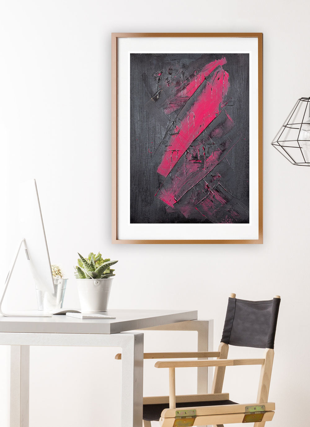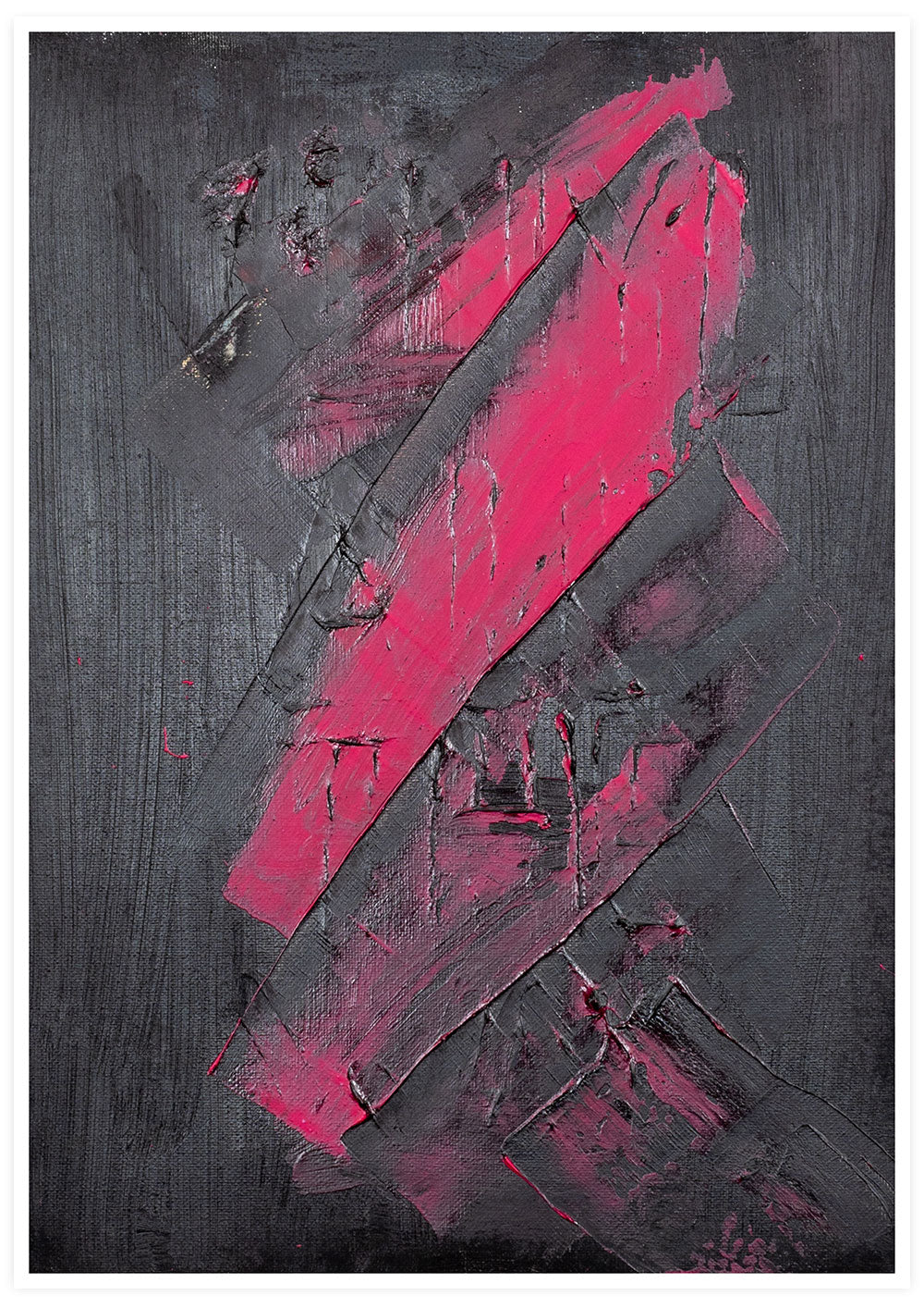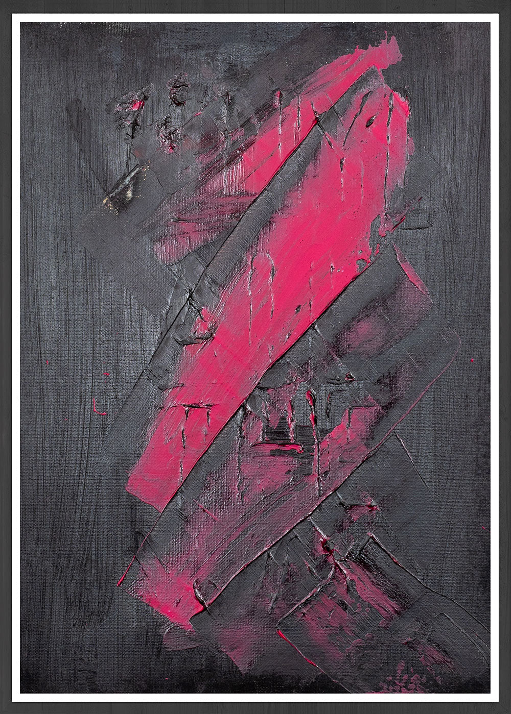 "This particular minimalist piece comprises of a black background with a splash of neon pink as the contrast. The story depicted in this artwork is that black is a depressing shade for many because it resembles a void. In order to cancel out the complete dark background of the abyss, I have applied the pink in volume with a pallet knife to give it depth and to allow the black and the pink to work in unison to create a vibrant modern stylish abstract. The neon pink overpowers the lifeless darkness with a warming fiery sensation.