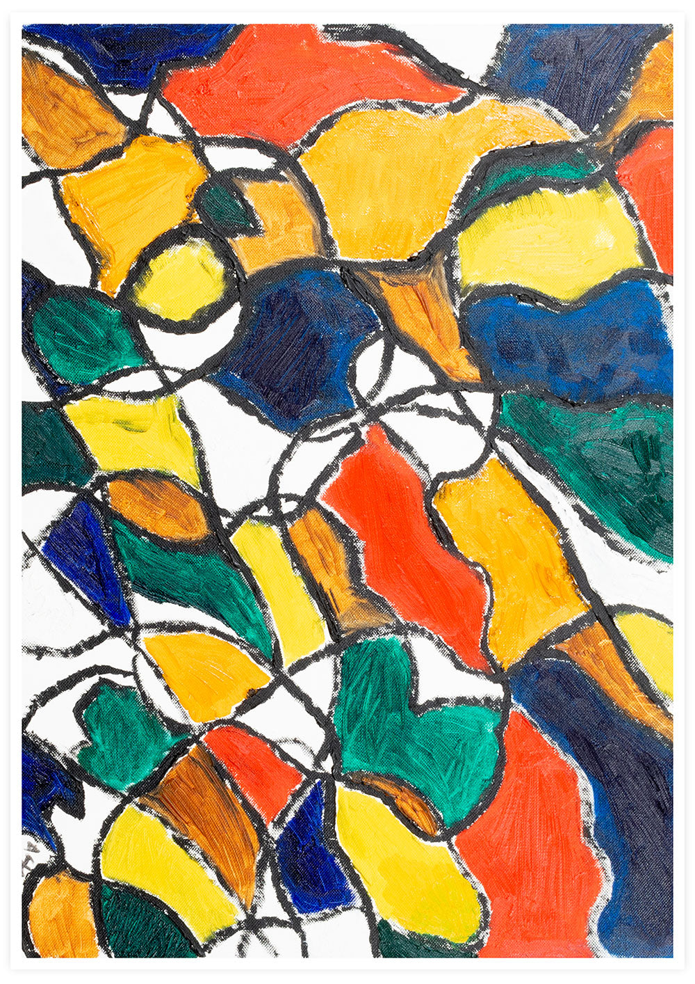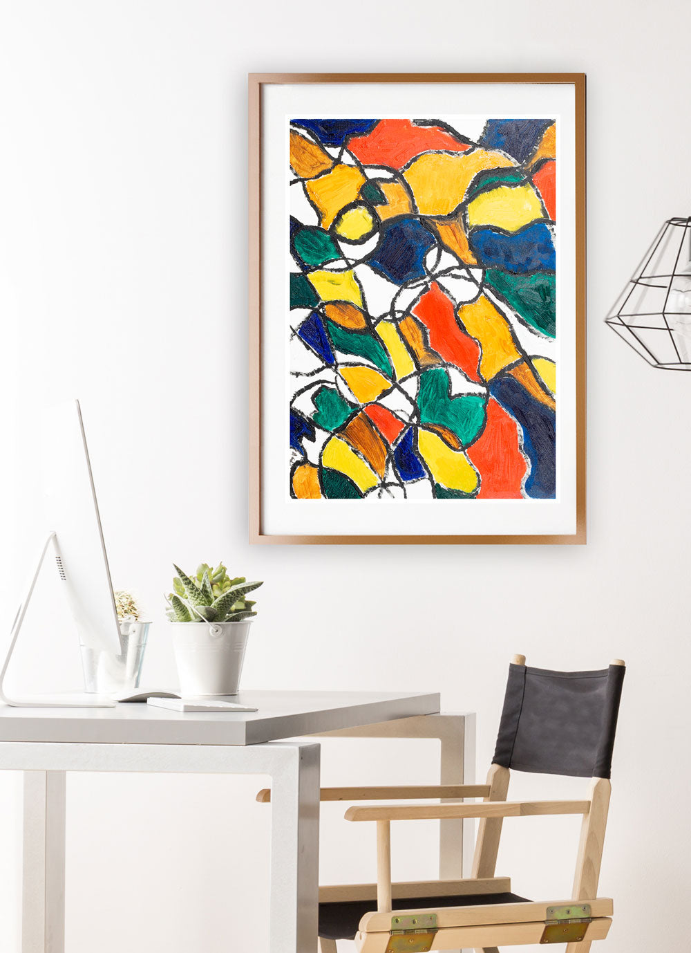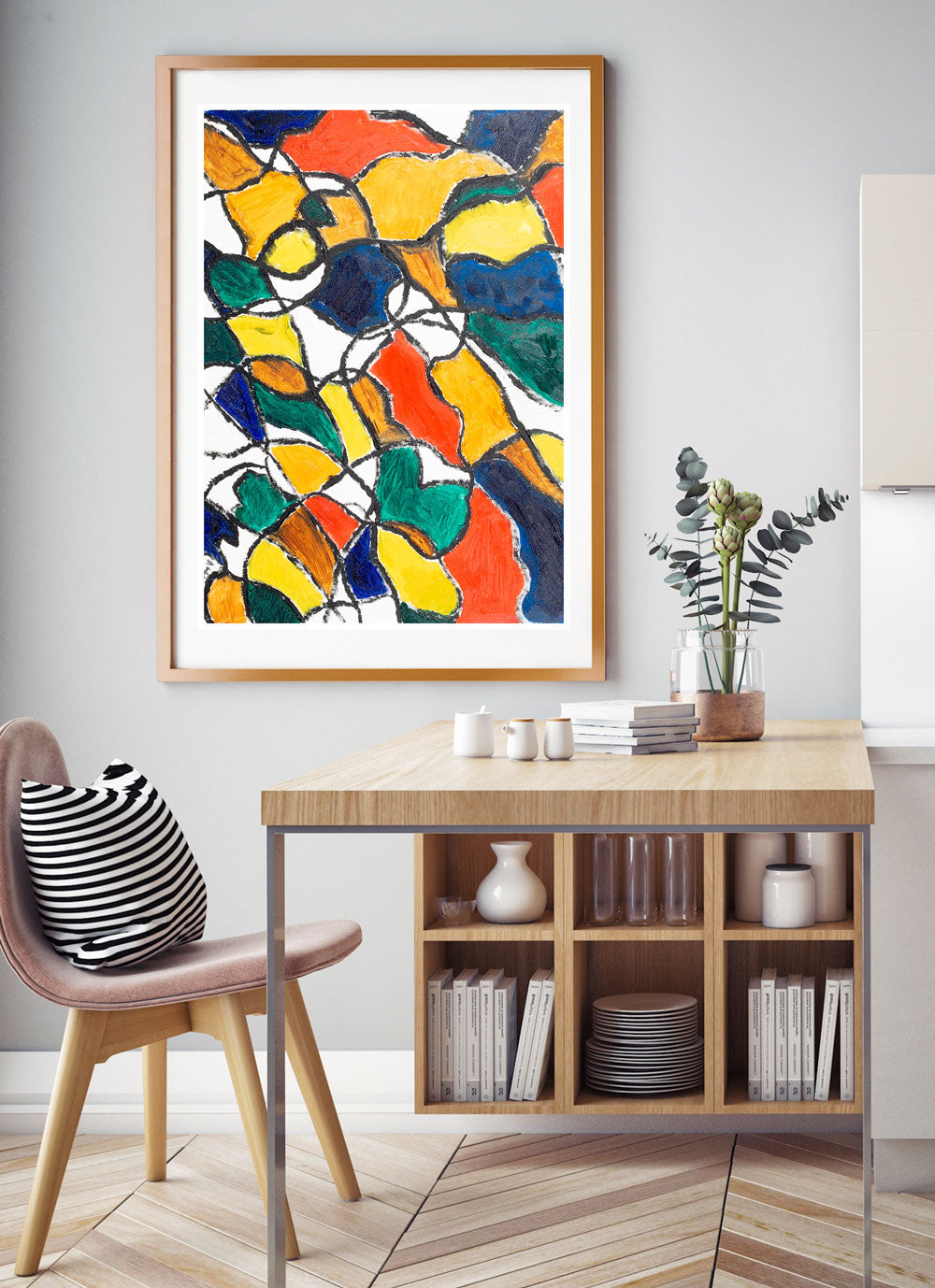 "An amalgamation of bright colours brought together within segmented shapes to fuse as one piece. This is one of the early works, experimenting with a mixture of rich colours on my pallet to create this bright and vibrant simple piece. This particular piece was hung in our hallway and received a lot of unexpected attention from visitors. I was commissioned by a family friend to create an identical piece for her home.