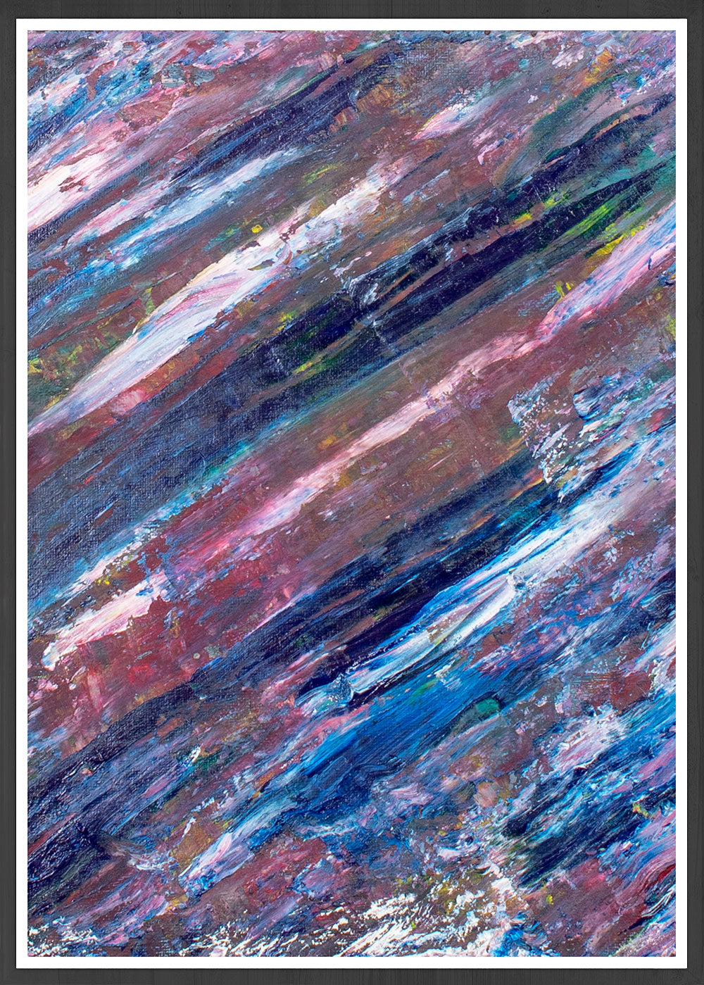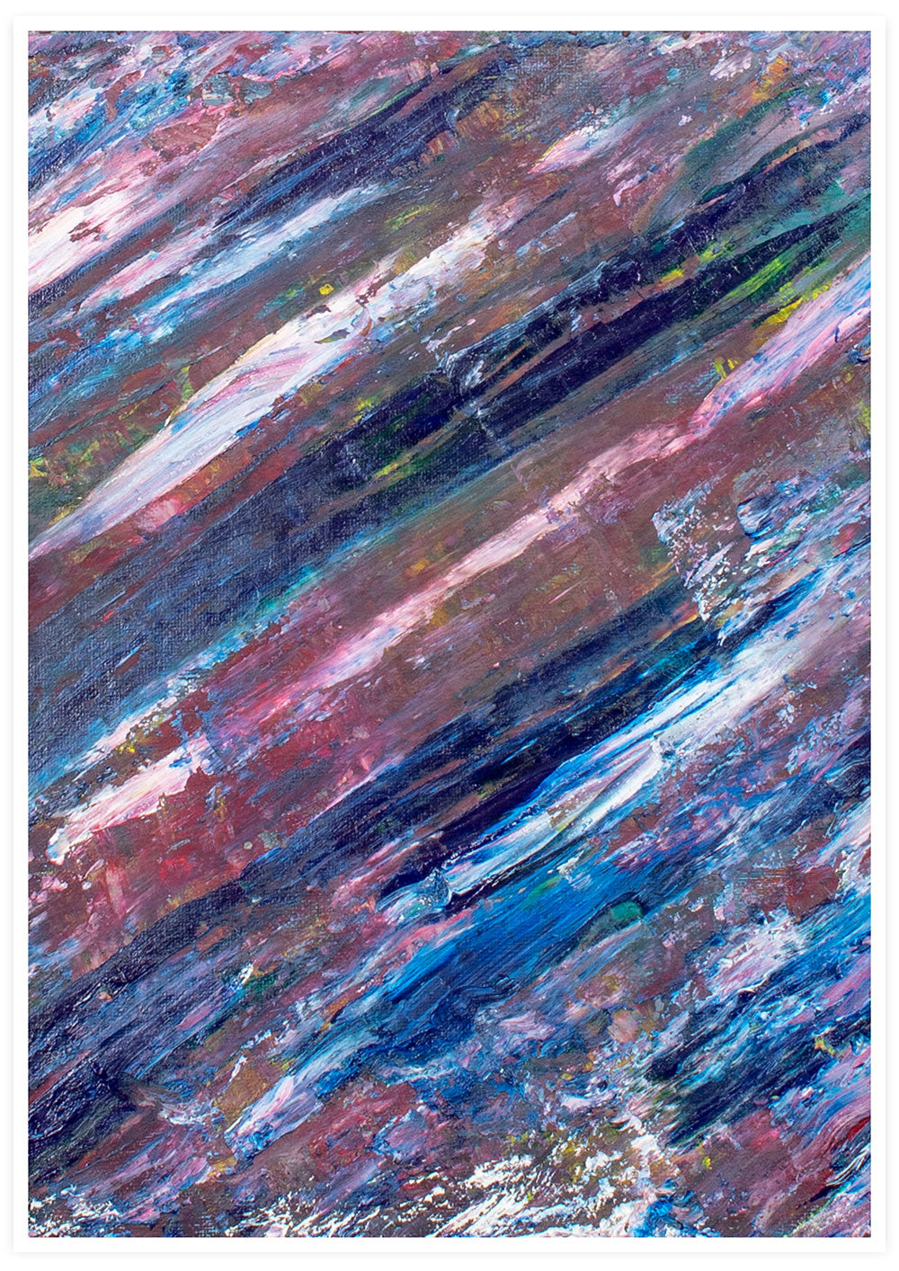 "This piece tells the story of a dreary, wet day in London and of a hopeful on-looker searching for a little brightness and positivity in amongst the dark skies.  The two splashes of white light at the center of the canvas represent thunderbolts behind cloudy shadows; the brighter colors which are attempting to break through, give the on-looker hope, as between and around the two thunderbolts are the beginnings of the most perfect of rainbows. The onlooker becomes increasingly intrigued by the evolving dynamic of the painting and the view, which confronts them, such as the hazed psychedelic rainbow beginning to overpower the dark sky above.