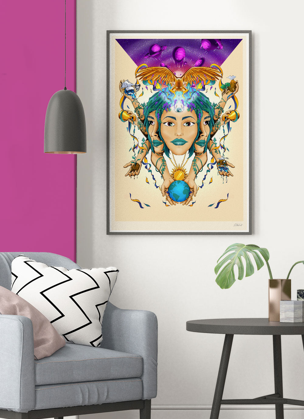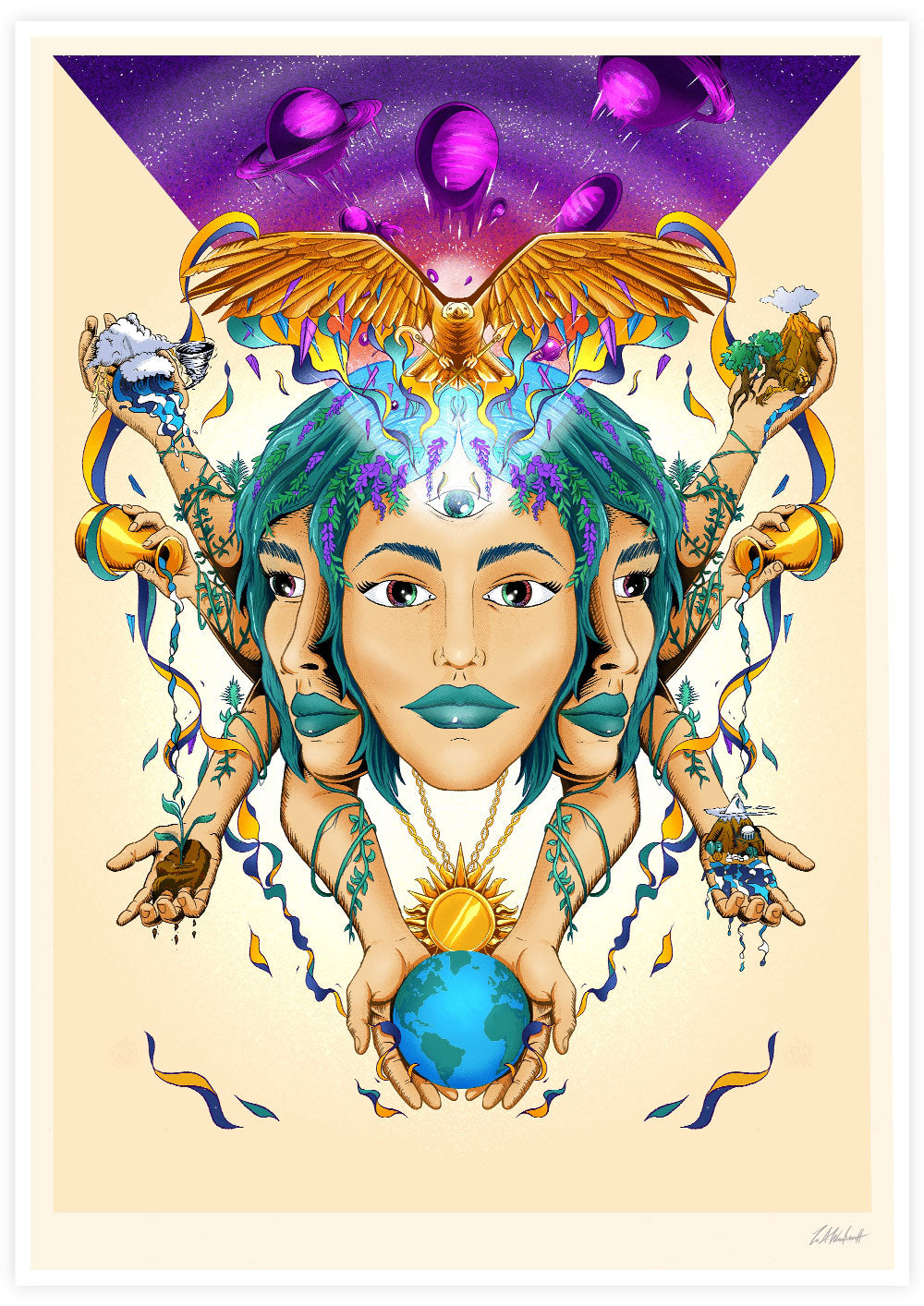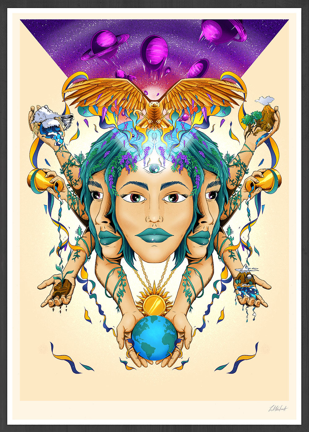 This illustration is mainly based on the creation of Geae and her union with Uranus, once together they didn‚¬„¢t just create the earth and atmosphere but they gave the universe above our heads for us to gaze up at and wonder.
