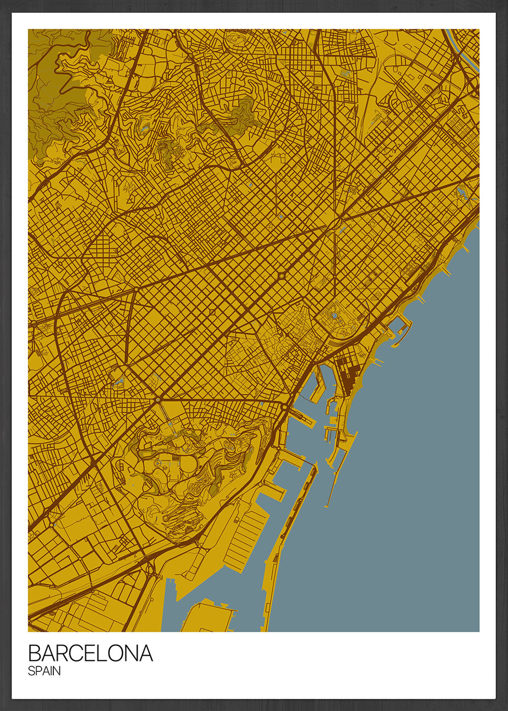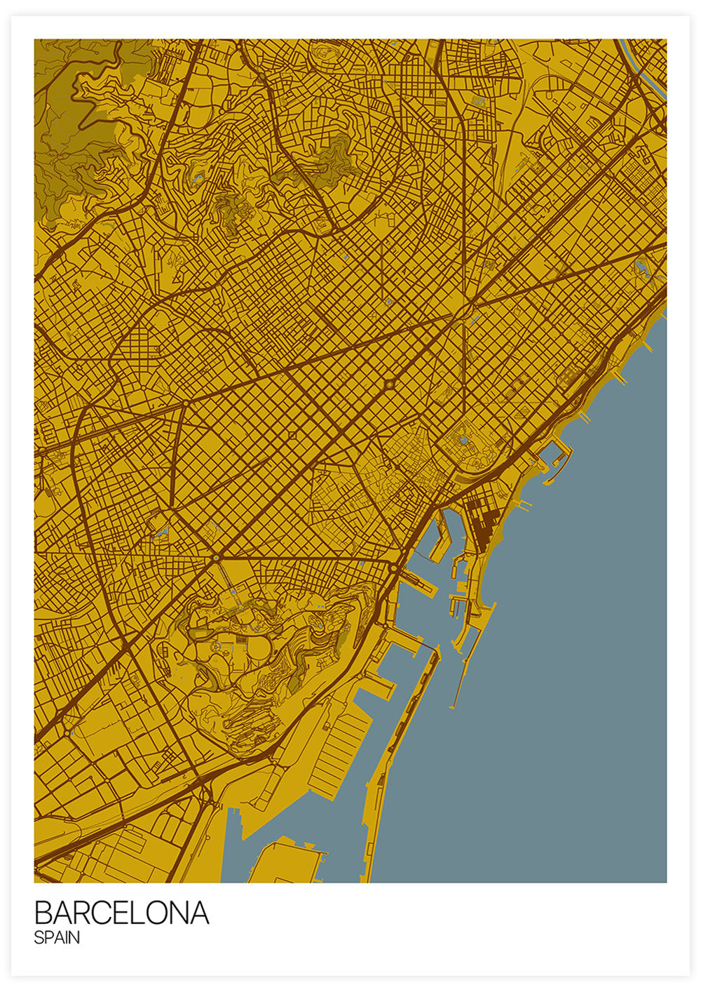 Barcelona City Map Wall Art by Mapply. European mega modern city art print in mustard and blue hues.