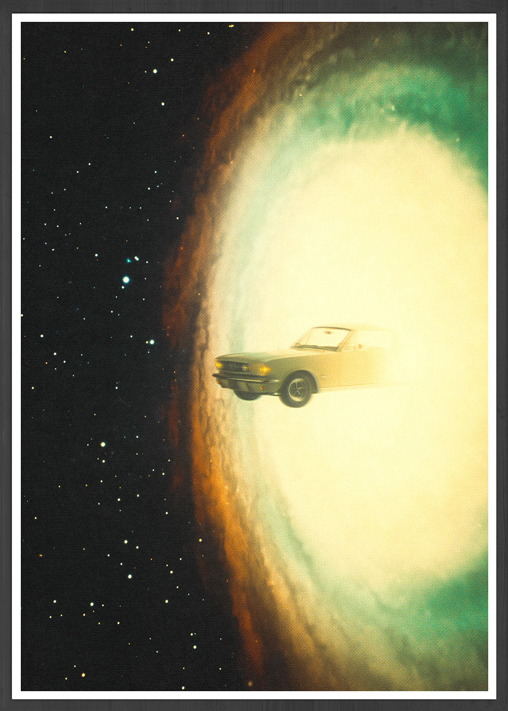 The artist masterfully uses perspective to create a sense of speed and momentum. The car is angled slightly downwards, as if just emerging from the wormhole, and its exhaust trail stretches behind it, emphasizing its rapid acceleration.