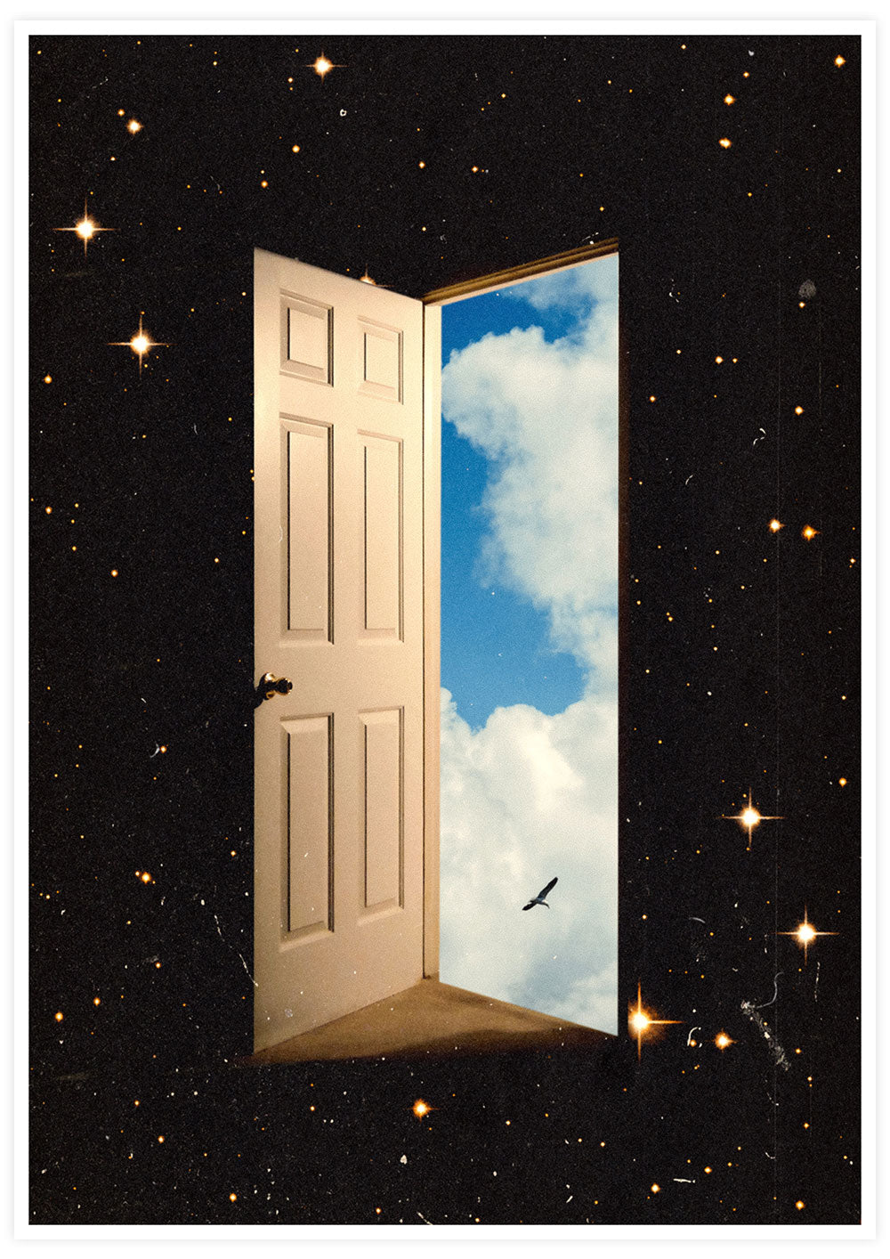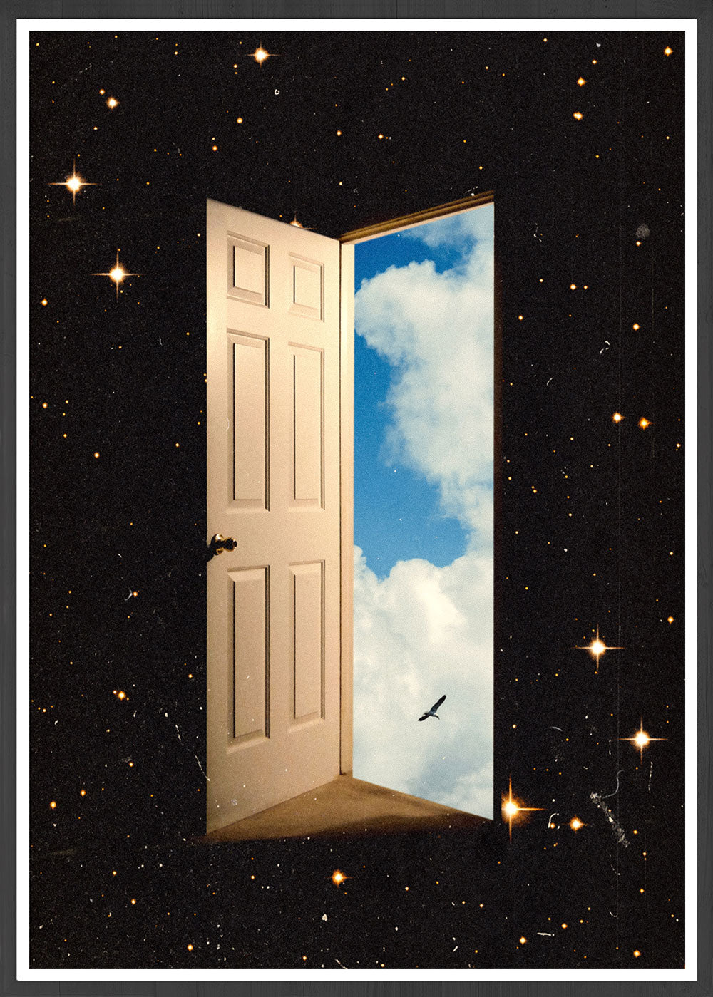The Portal Collage Print.  Doors in space are strange.  Doors in space which open to a sky are awesomely surreal.