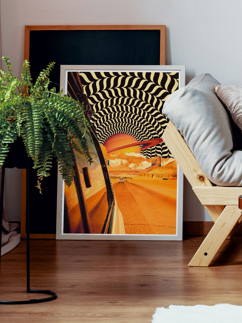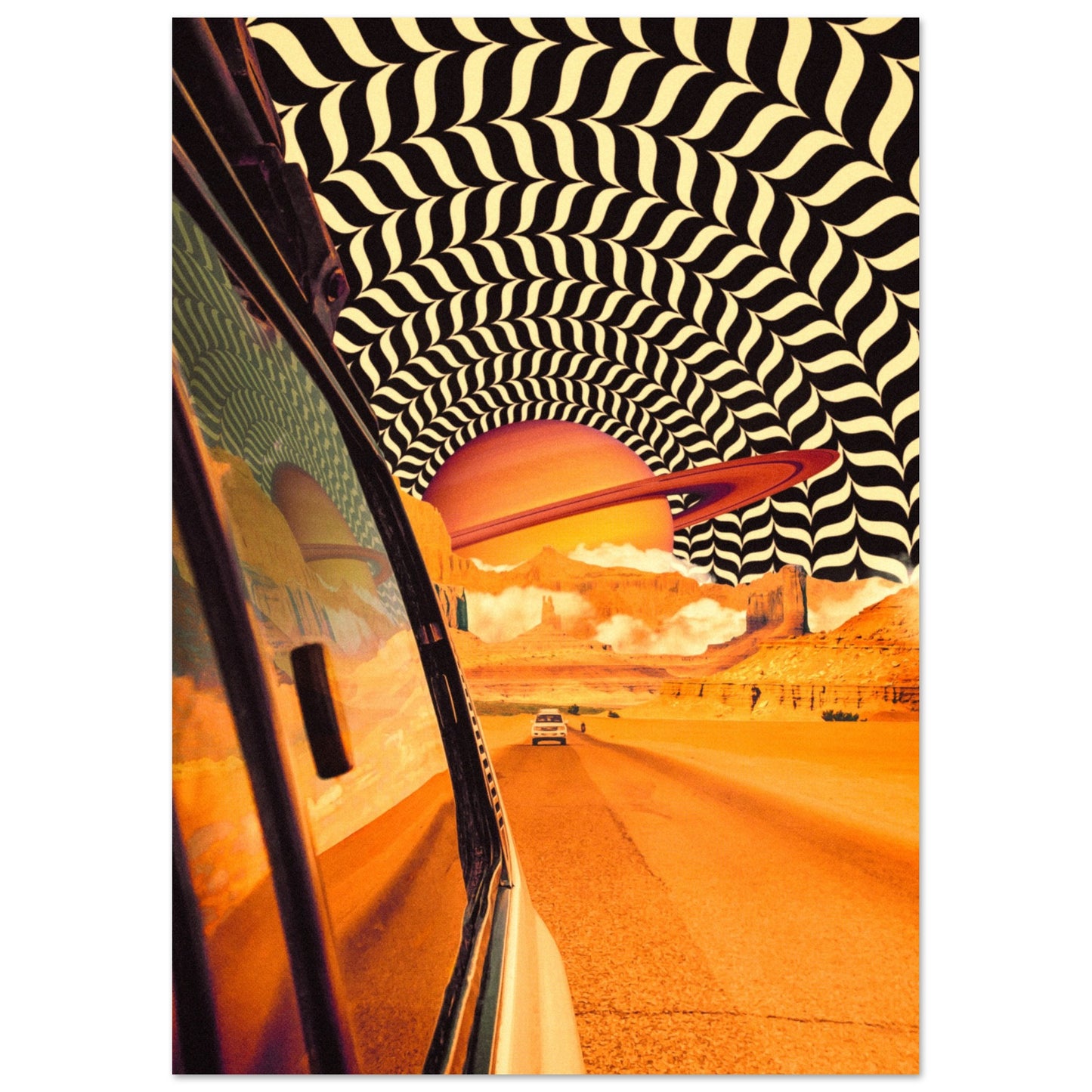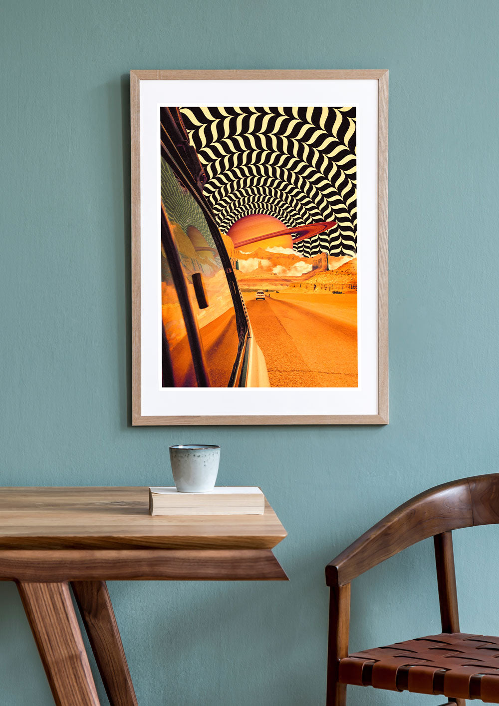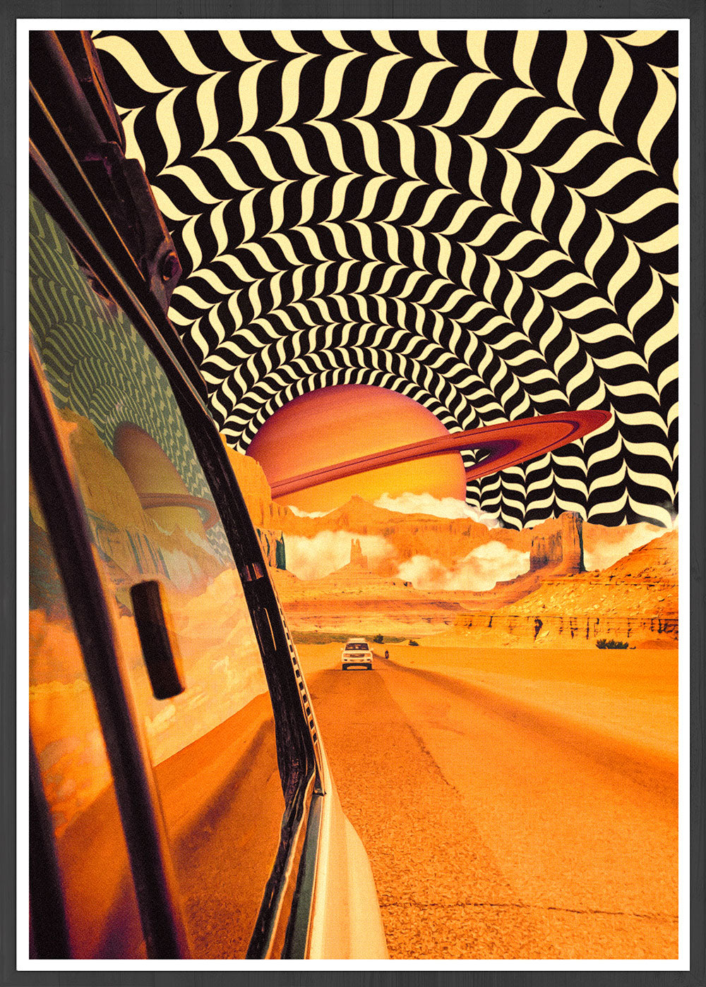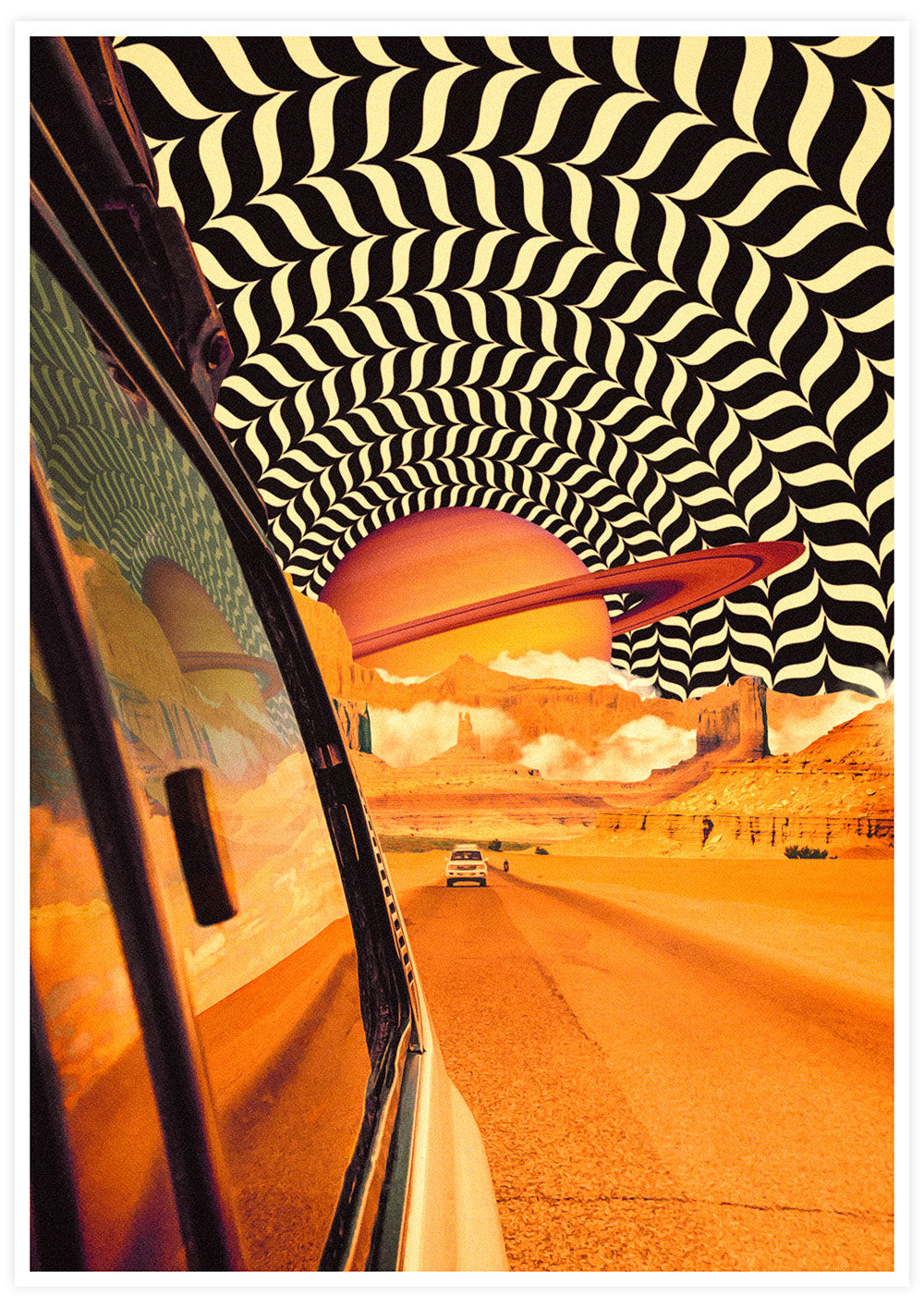 The Real Road Trip II Collage Print. This trippy art print by Taudalpoi fuses retro 70s aesthetic with funky patterns and a sci-fi injection.