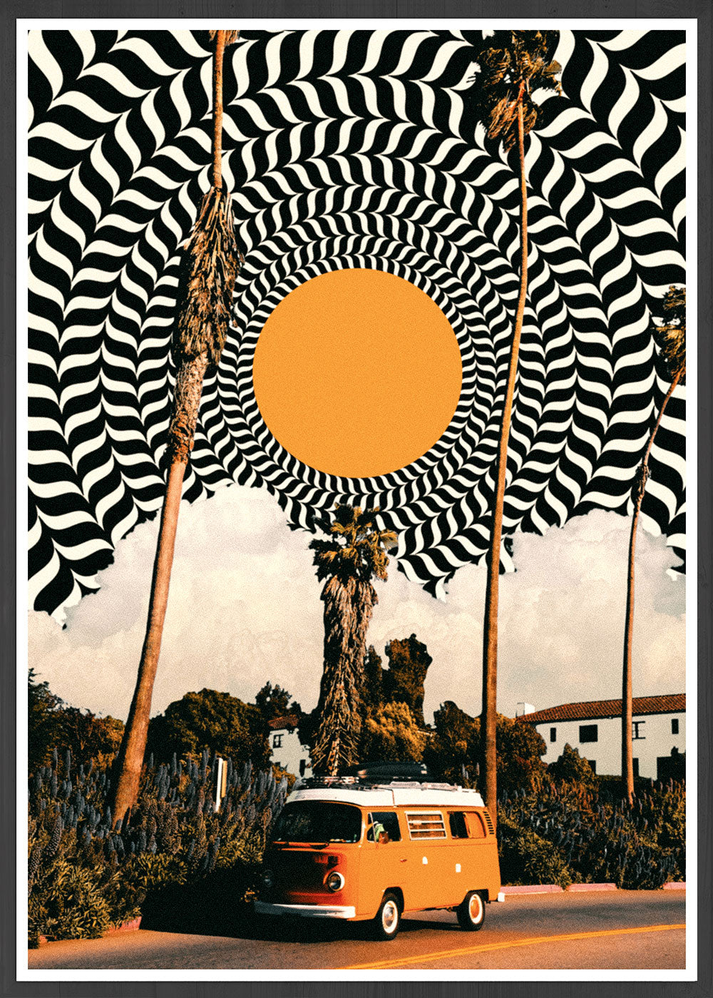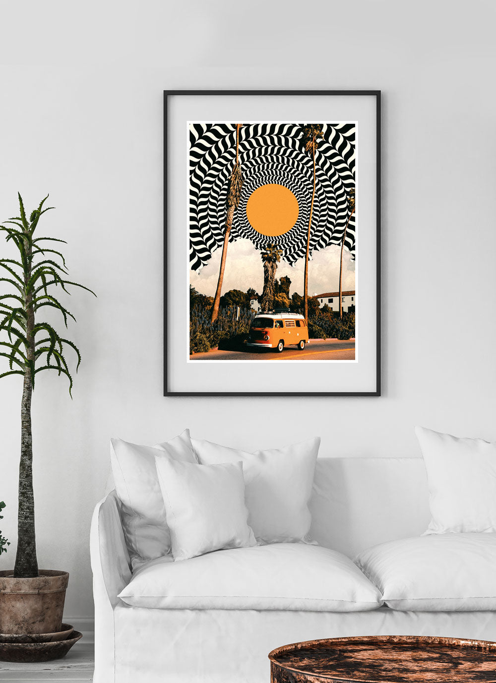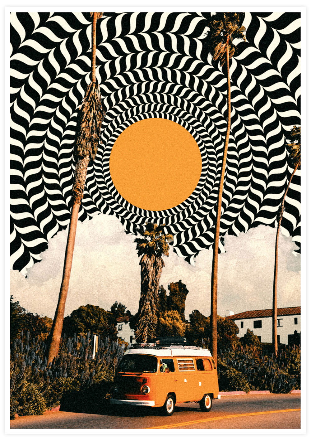 Where we going? Collage Art Poster by Taudalpoi. Search the realm of possibility with this vintage retro art print. Explore your own in the trippy pattern design in the sky, beautifully complemented by the bold yellow sun and the retro collage cut-outs below.