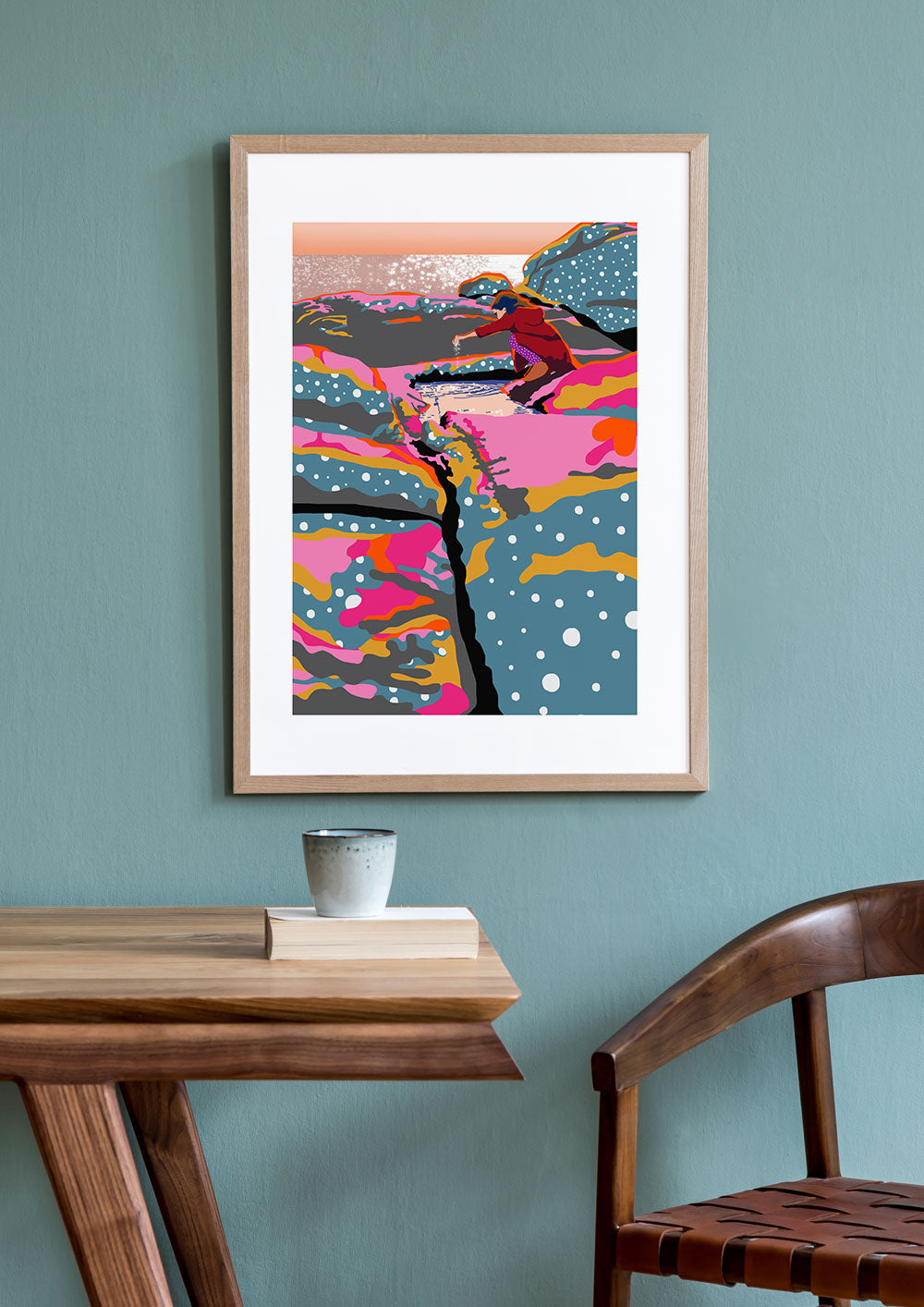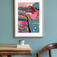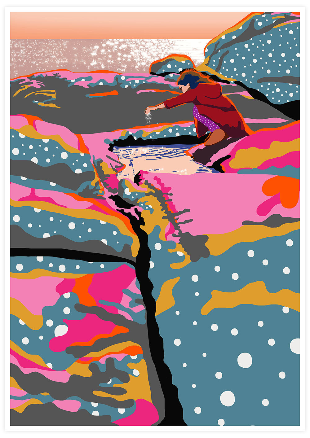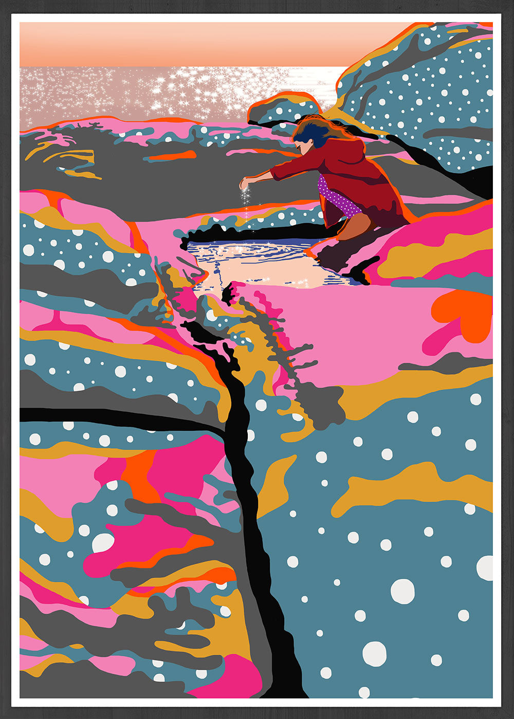 Dive into a world of vibrant marine life and sun-drenched wonder with "Rockpool Magic," a captivating digital art print by Unratio. This whimsical piece transports you to a hidden cove, where a shallow tide pool teems with colorful treasures. Sunlight filters through the crystal-clear water, illuminating a dazzling array of creatures: