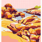 A Landscape of Mesmerizing Beauty: The artwork depicts a dramatic rock formation jutting out into a calm bay. The sky above is ablaze with a mesmerizing blend of fiery oranges, soft pinks, and deep purples, reflecting vibrantly on the water's surface. Gentle waves lap against the rocks, creating a sense of peace and tranquility. The distant horizon hints at the vastness of the ocean, adding a touch of mystery to the scene.