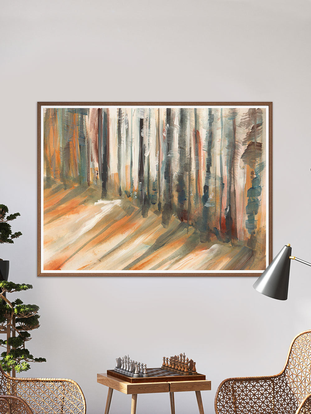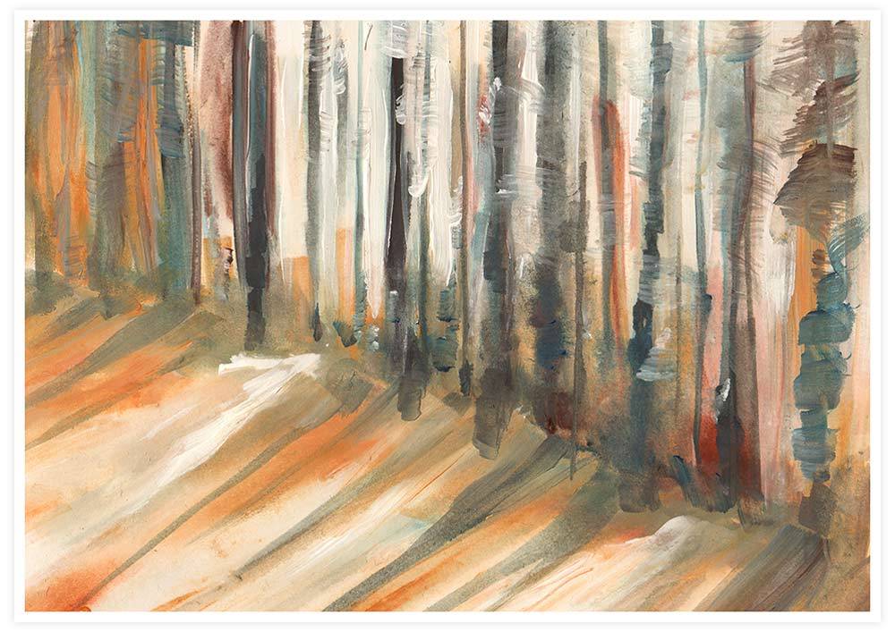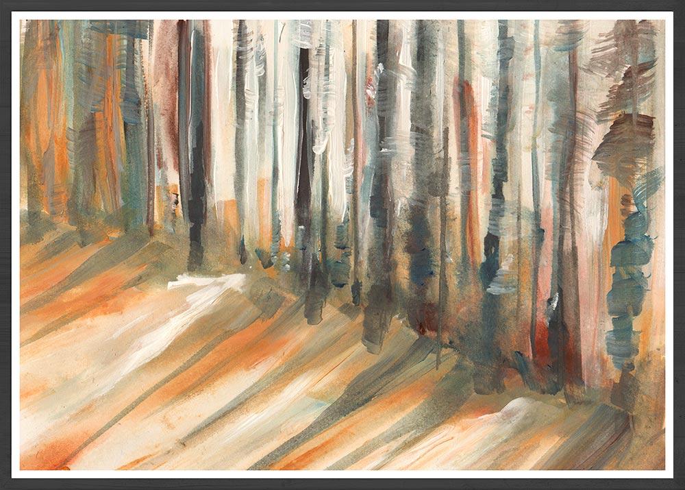 Bullfrog Forest Landscape Painting by Bart E. Slyp. Acrylic Painting. Sun shining through trees in this wonderful art print by Bart. The colours of this one create an amazing memory of the sun going down in the distance and beaming through the trees to create stunning lines of orange, yellow and white.