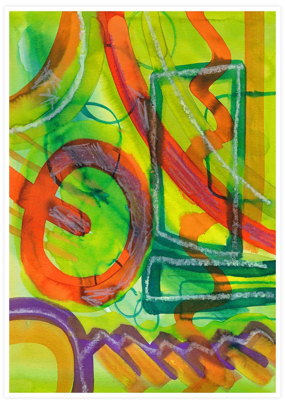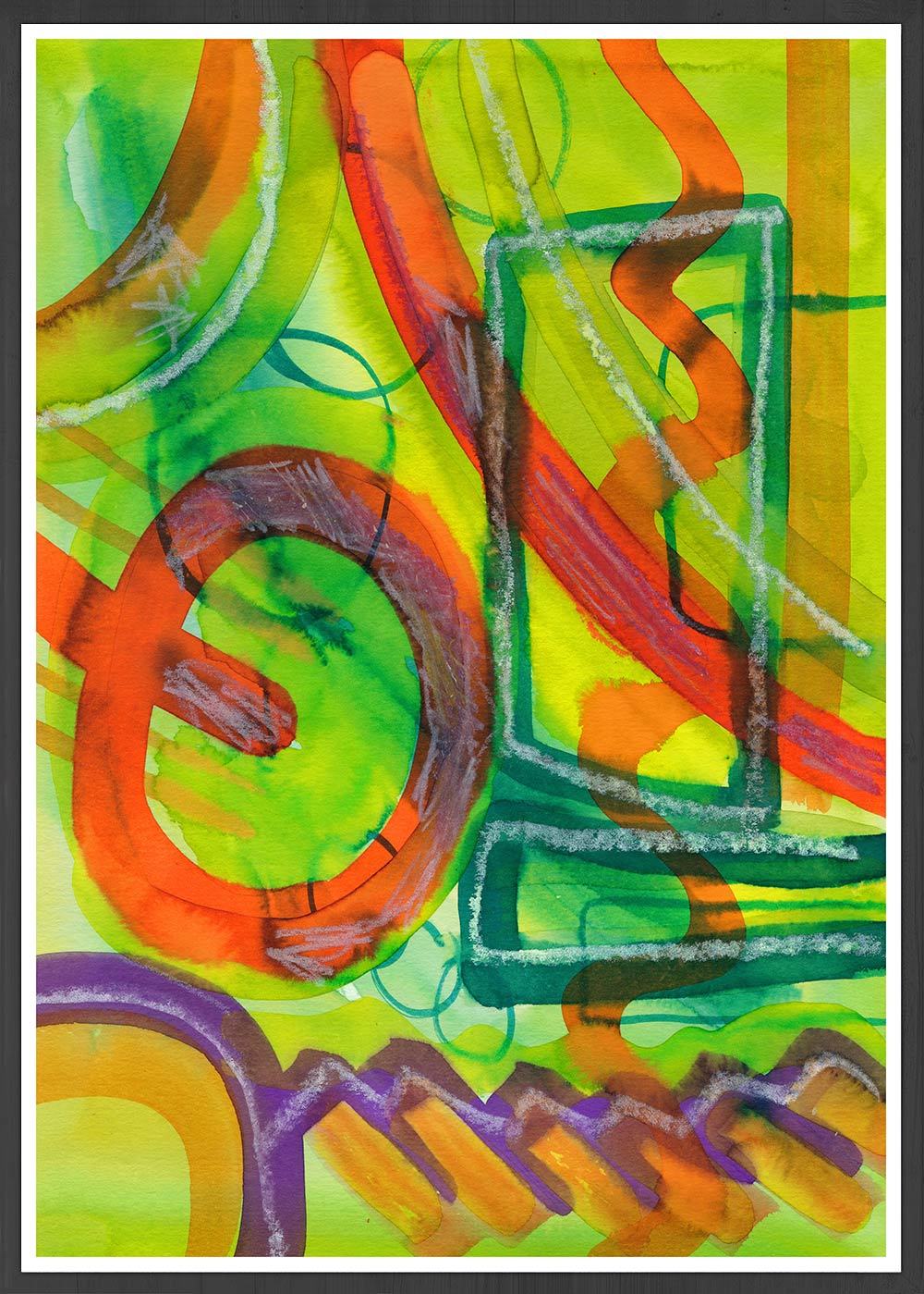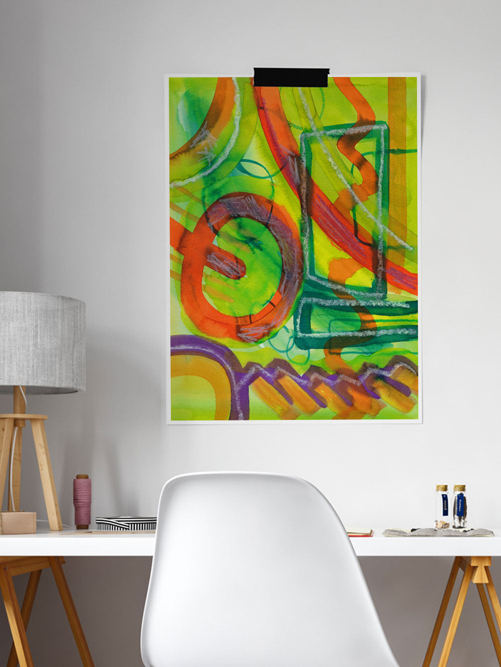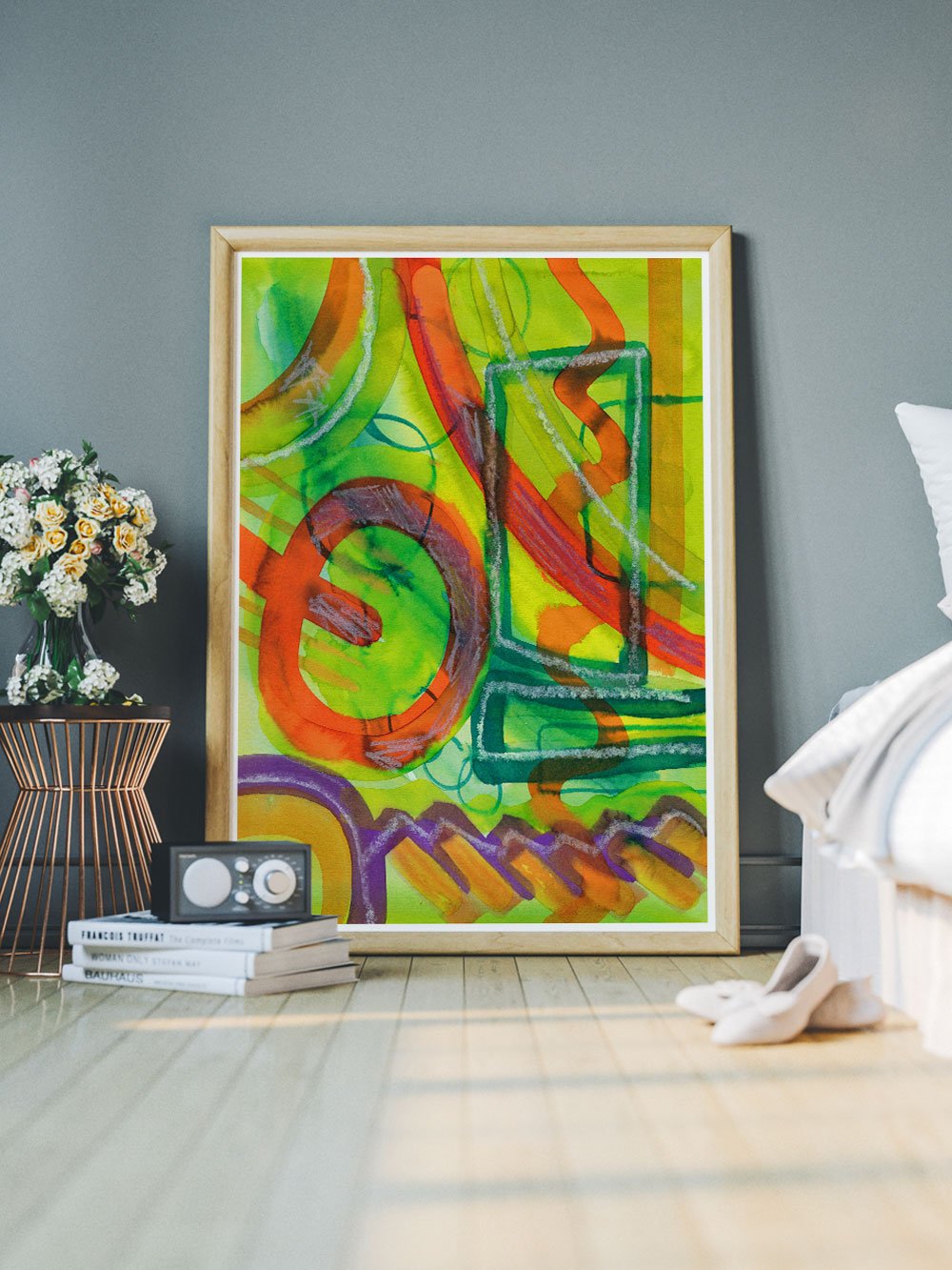 Perlie Abstract Fine Art by Elvira Errico. Acrylic Painting. It's just apparent chaos. This beautiful acrylic abstract wall art is perfectly balanced in colour and theme with stunning hues of green and red. Not to be missed, this print would look stunning in a minimal lounge or bedroom interior room.