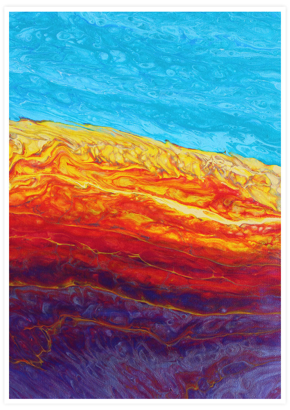 This is a fluid art abstract landscape in acrylic made with colors ranging from purples, reds, and yellows. The sky is made from 3 different blue colors mixed together to create a marbled look.