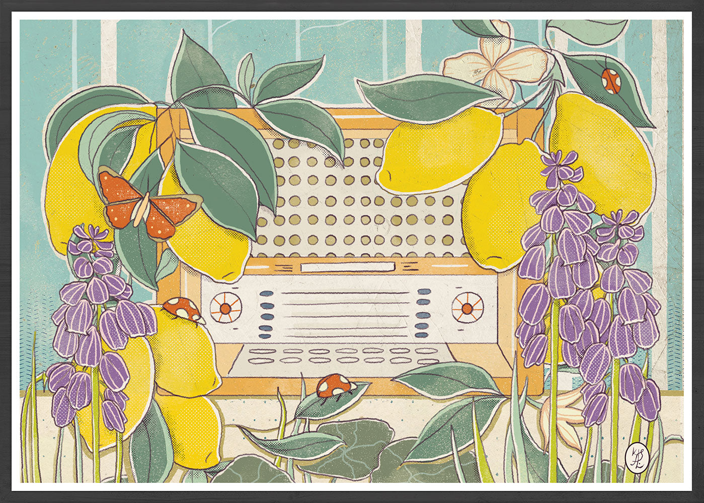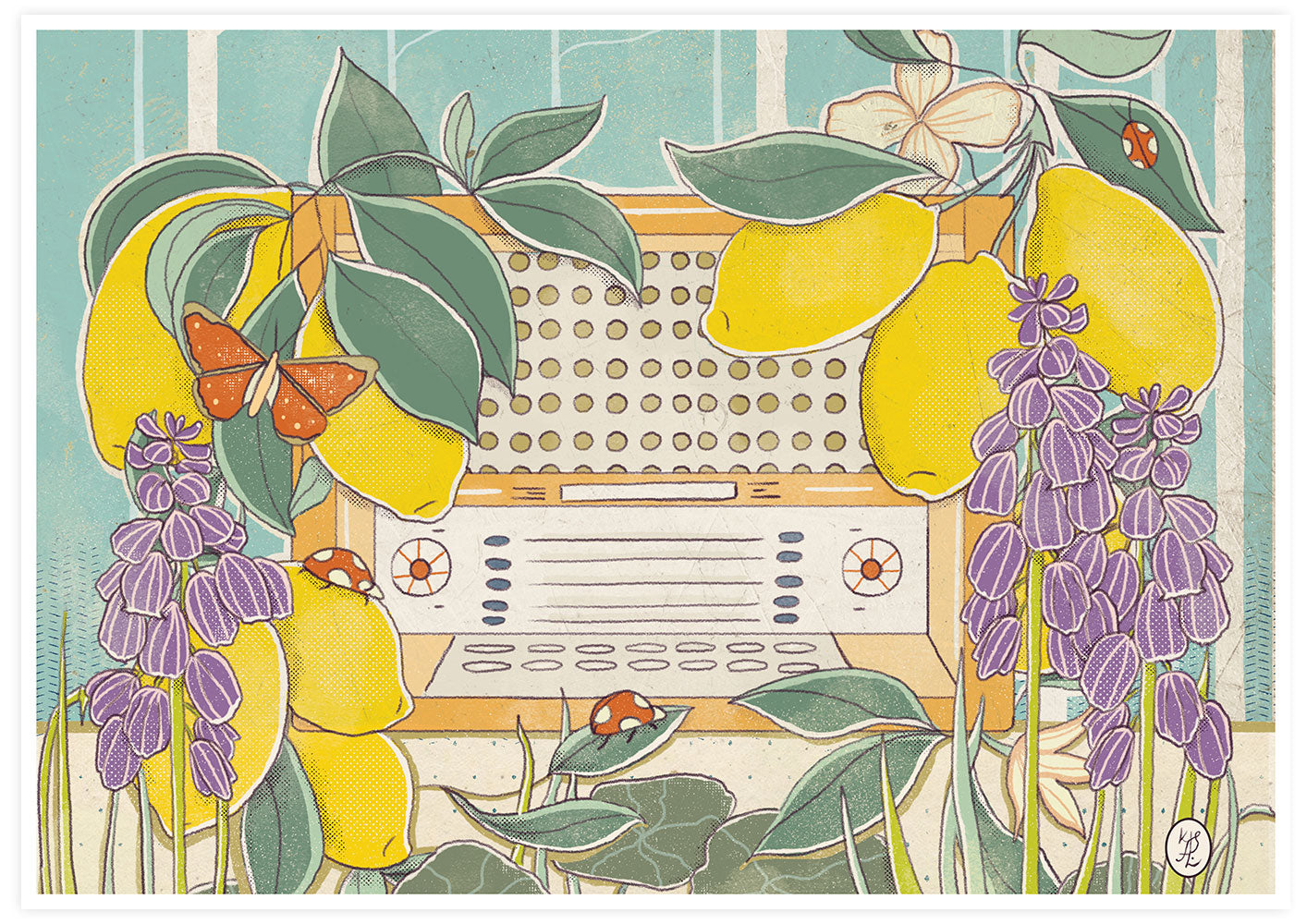In this cozy garden every little creature and petal is full of life and energy. A retro radio covered by branches of a lemon tree reminds us of summer sunshine and slow relaxed afternoons.