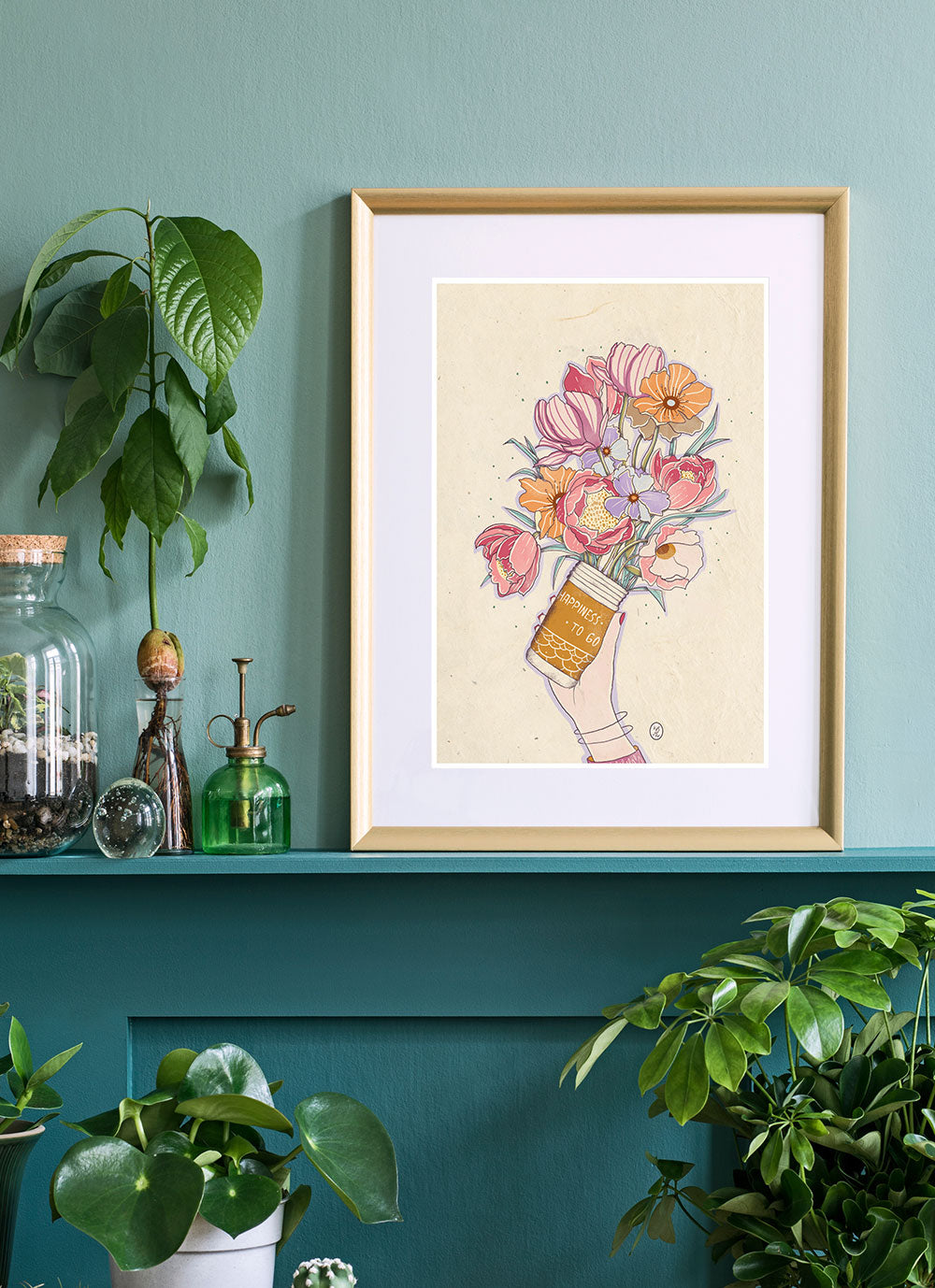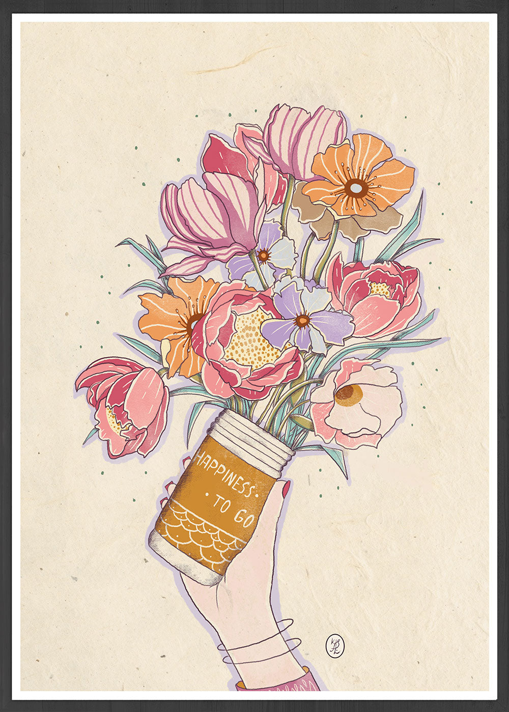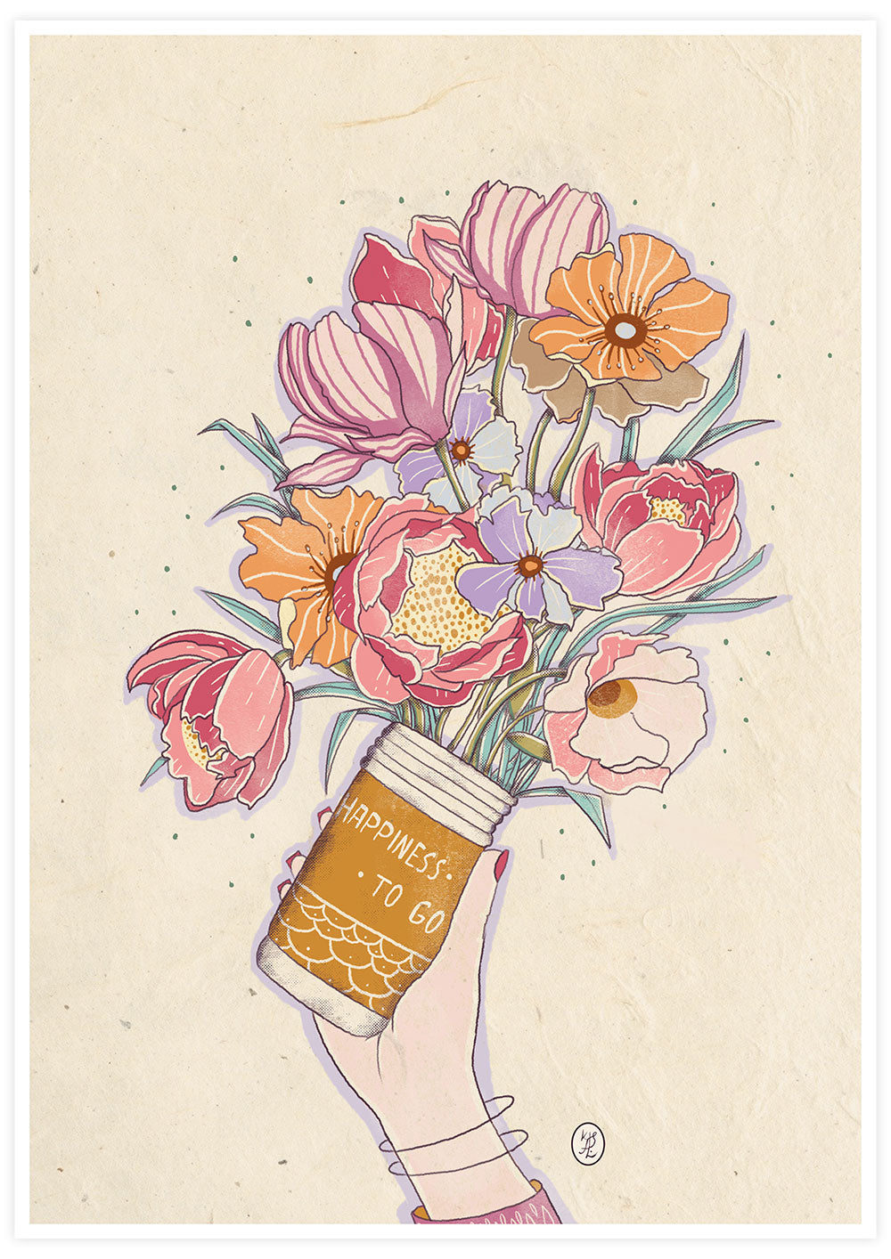 Happiness to go. This is how we can call buying plants or flowers in a shop. It feels amazing to carry home a little green friend or a fresh bouquet of flowers! Detailed line drawing with retro textures for a perfect sunny mood.