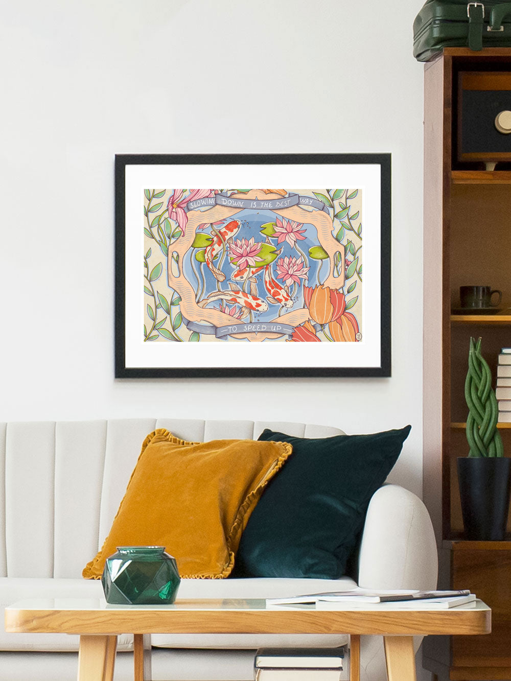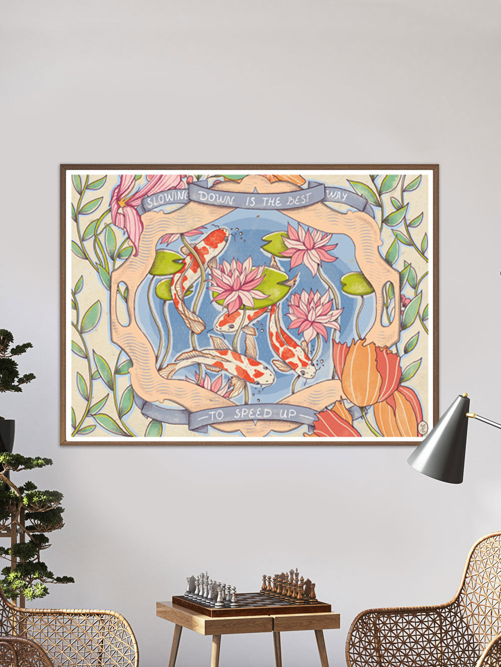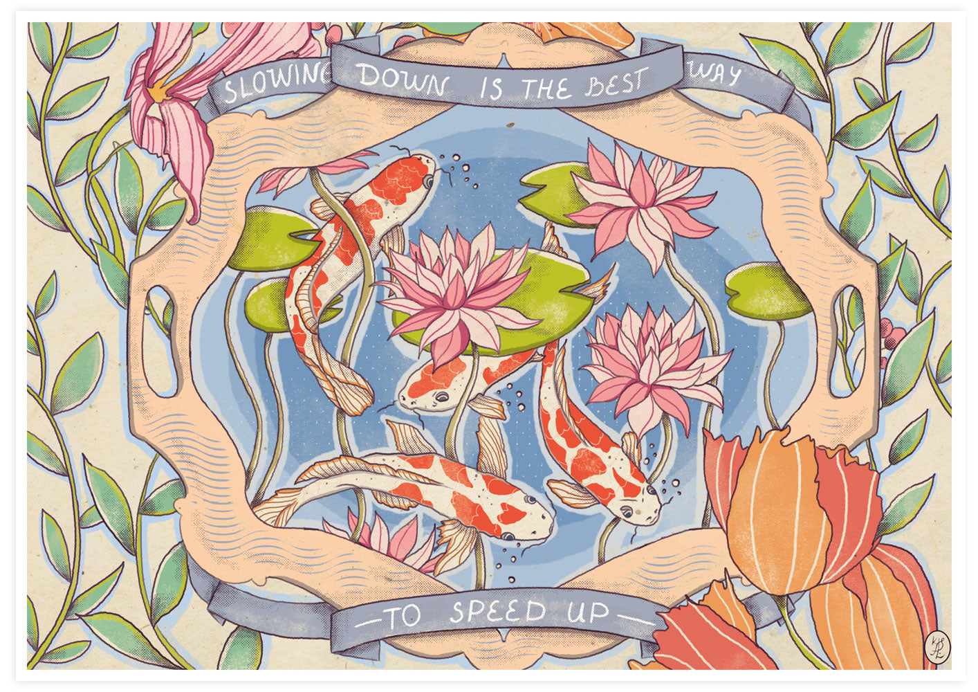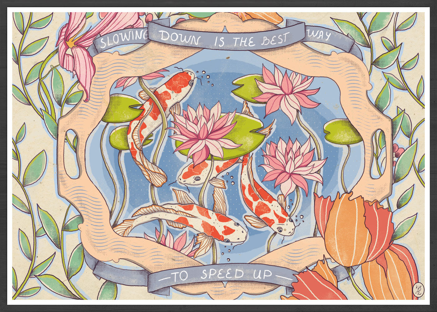 Sometimes slowing down can turn out to be the best way to speed up. Take a look into water of this imaginary pond with koi fish swimming around surrounded by beautiful flowers and remind yourself to take things slow and enjoy the way.