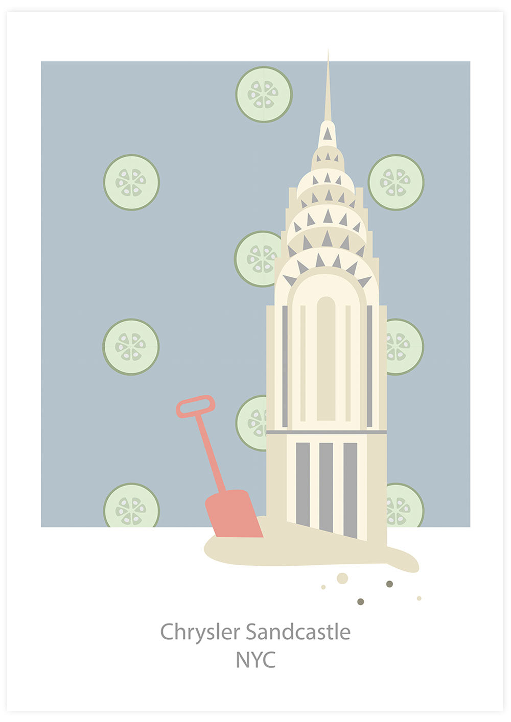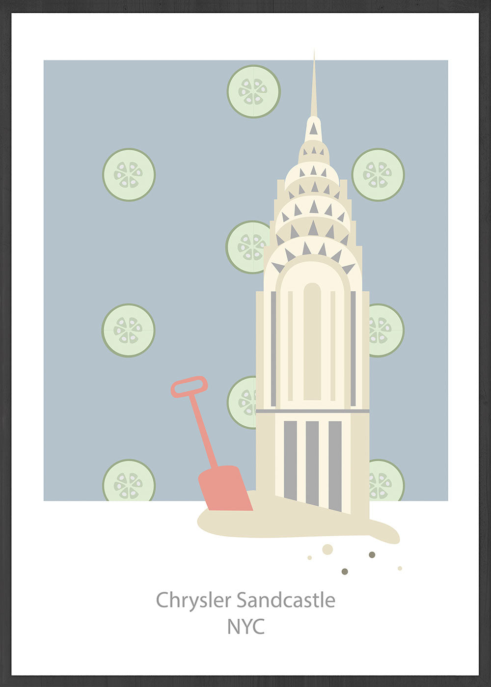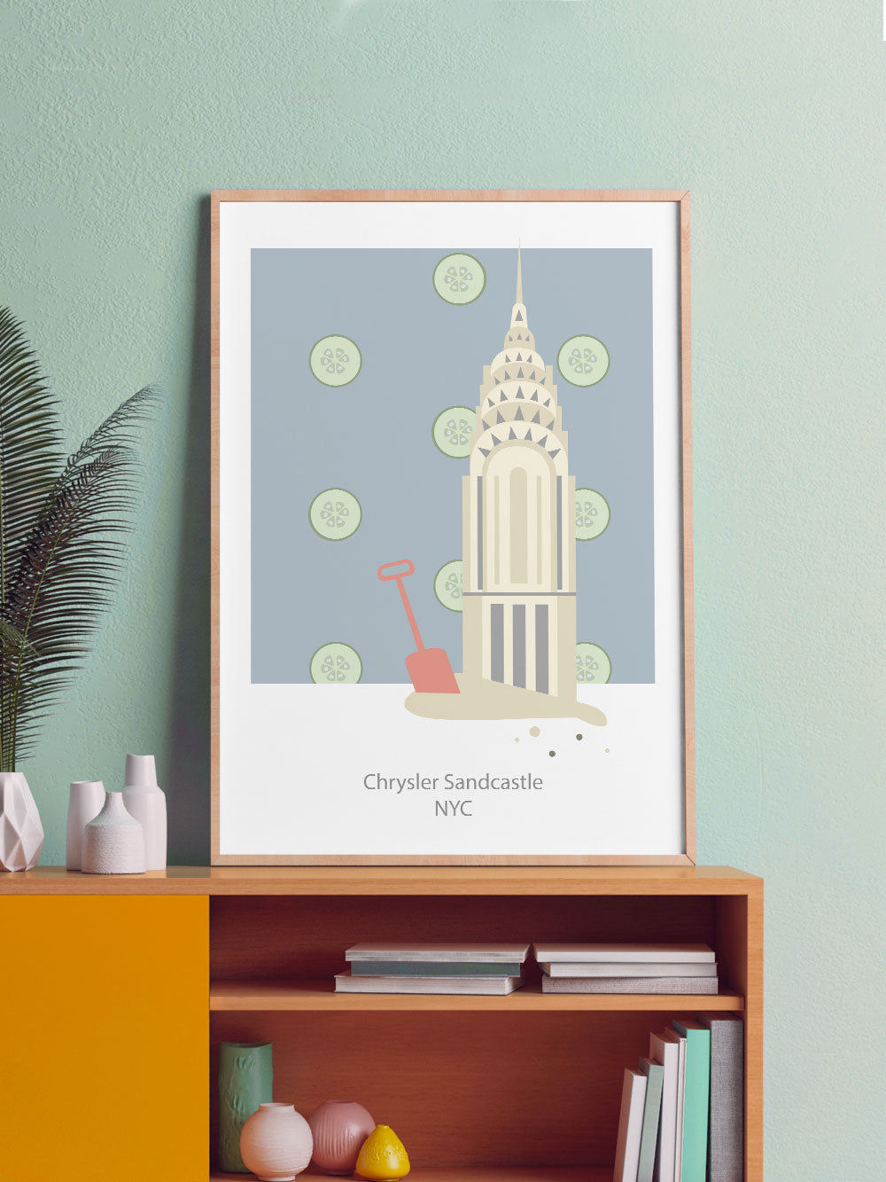 Chrysler Sandcastle New York Print by Griffin and Plumb. The Chrysler building, Sydney Opera House and Guggenheim Museum make their sandy arrival on the beach as sandcastles. The backdrop for an ice-cream, cucumber sandwich and stick of rock picnic.