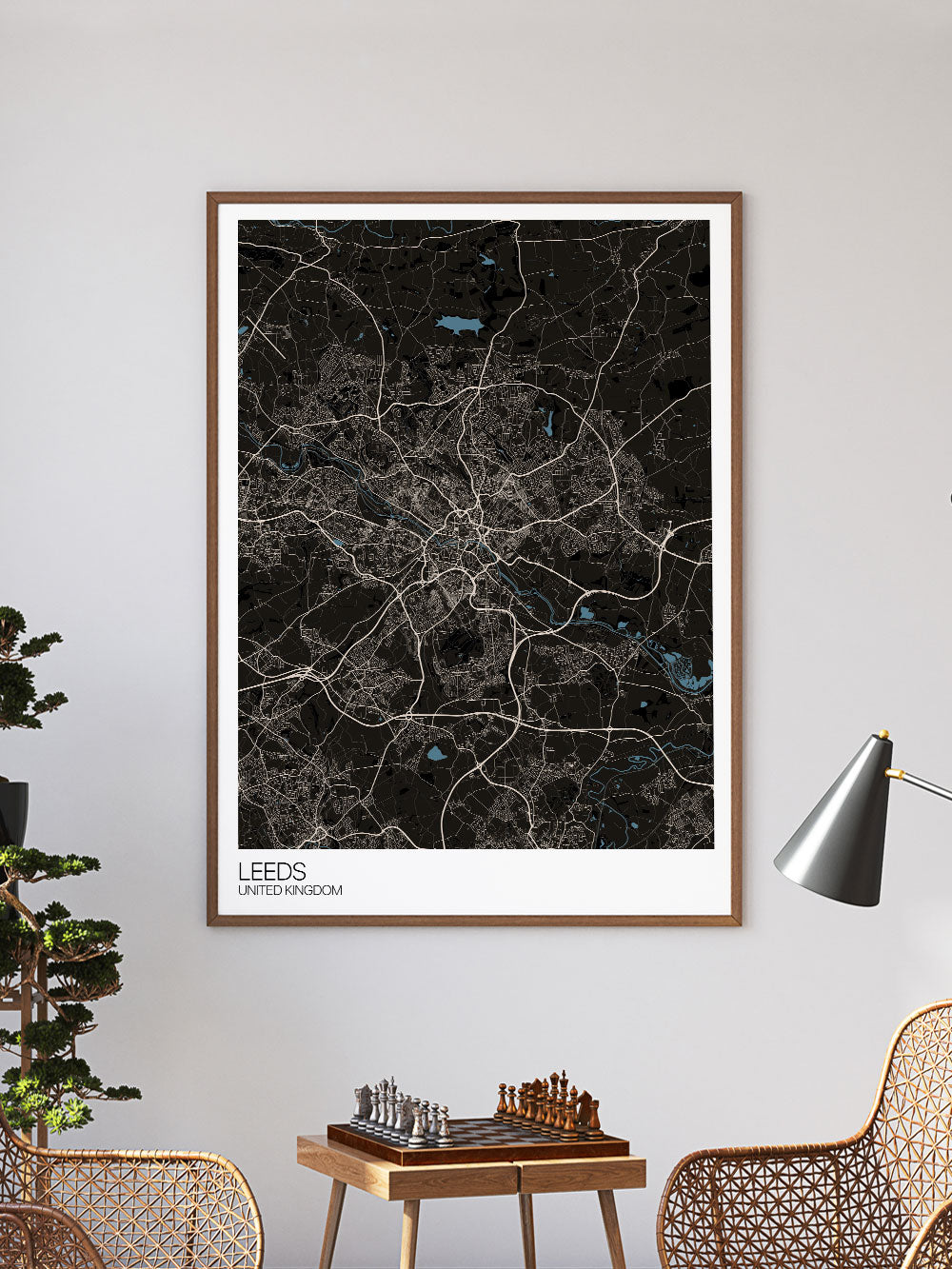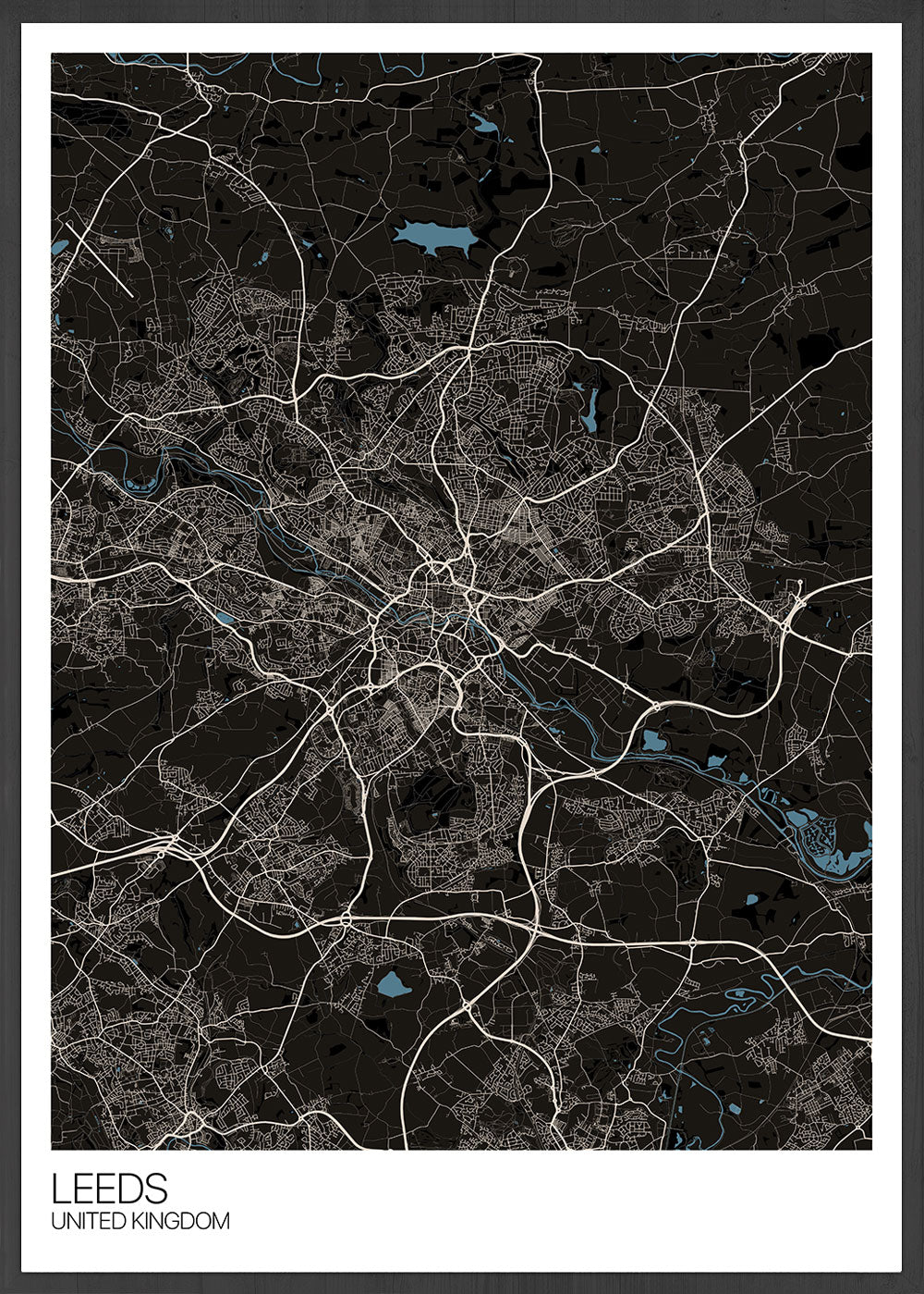 Leeds UK City Map Art. Unofficial central hub of North Yorkshire. Leeds wall art map in black and grey colours.