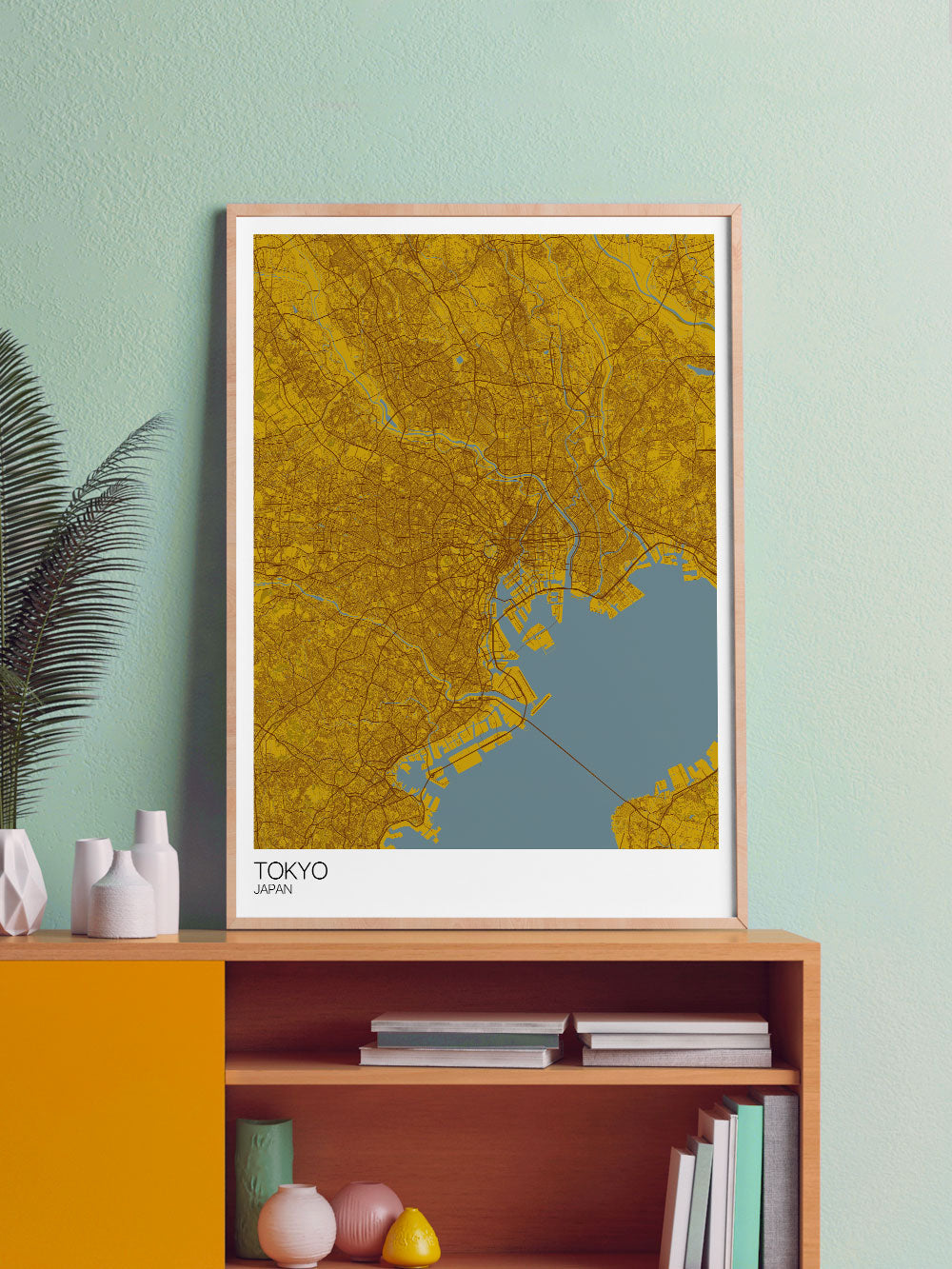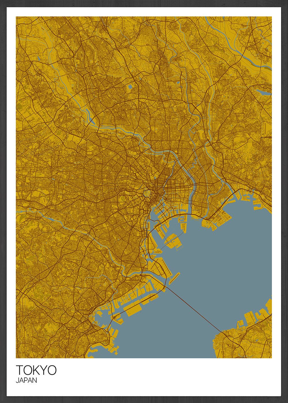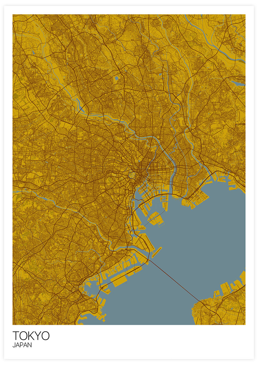 Tokyo City Map Print by Mapply. This stunning map is perfect for the travellers and city map fans. Tokyo, Capitol City of Japan Wall Art Print in mustard and grey/blue.