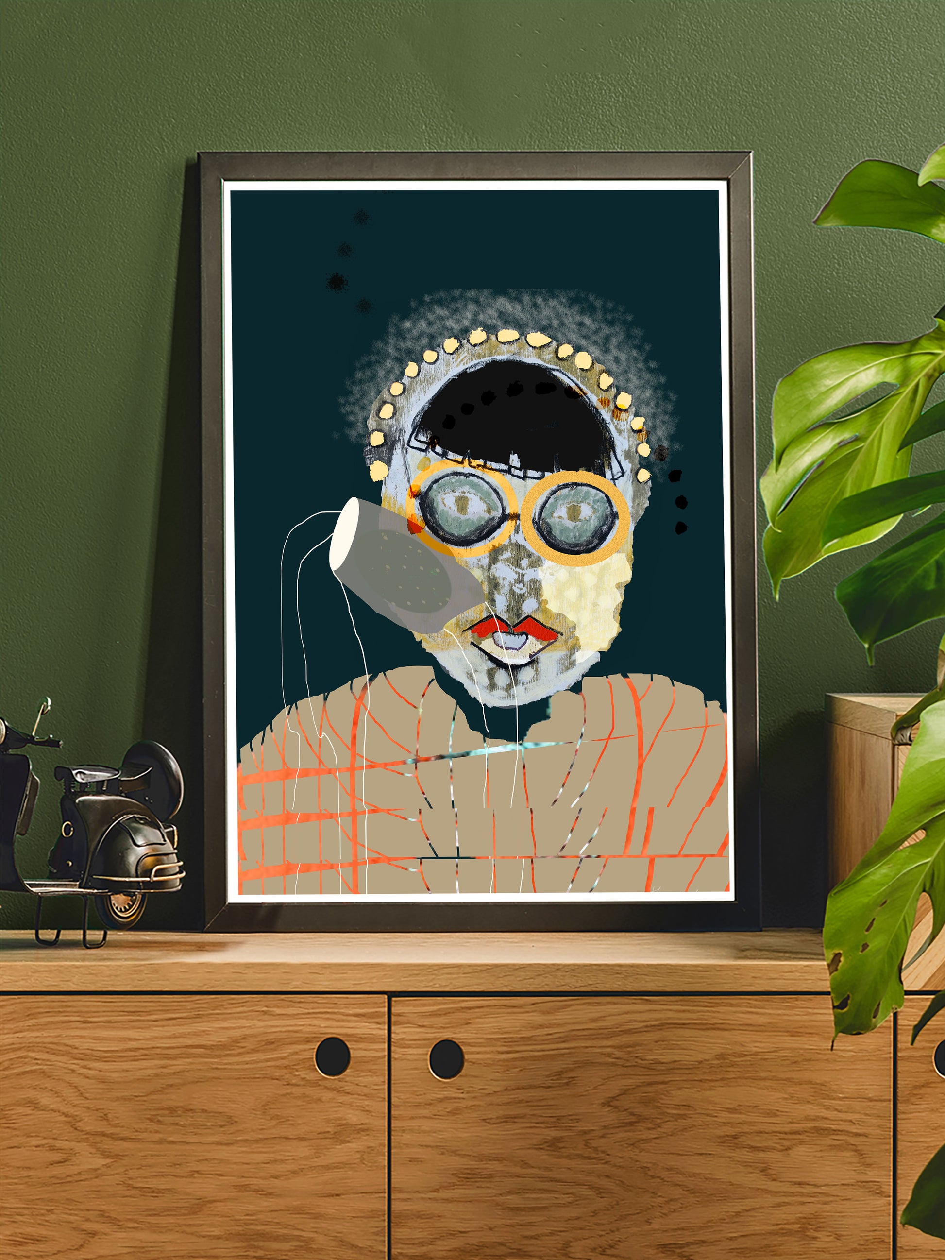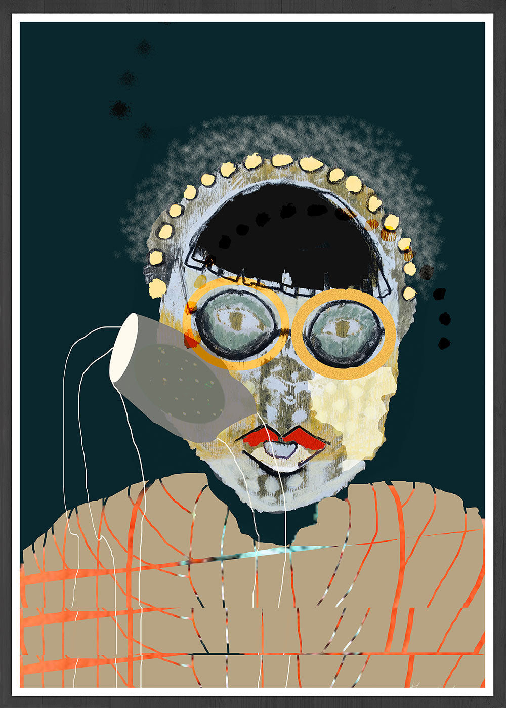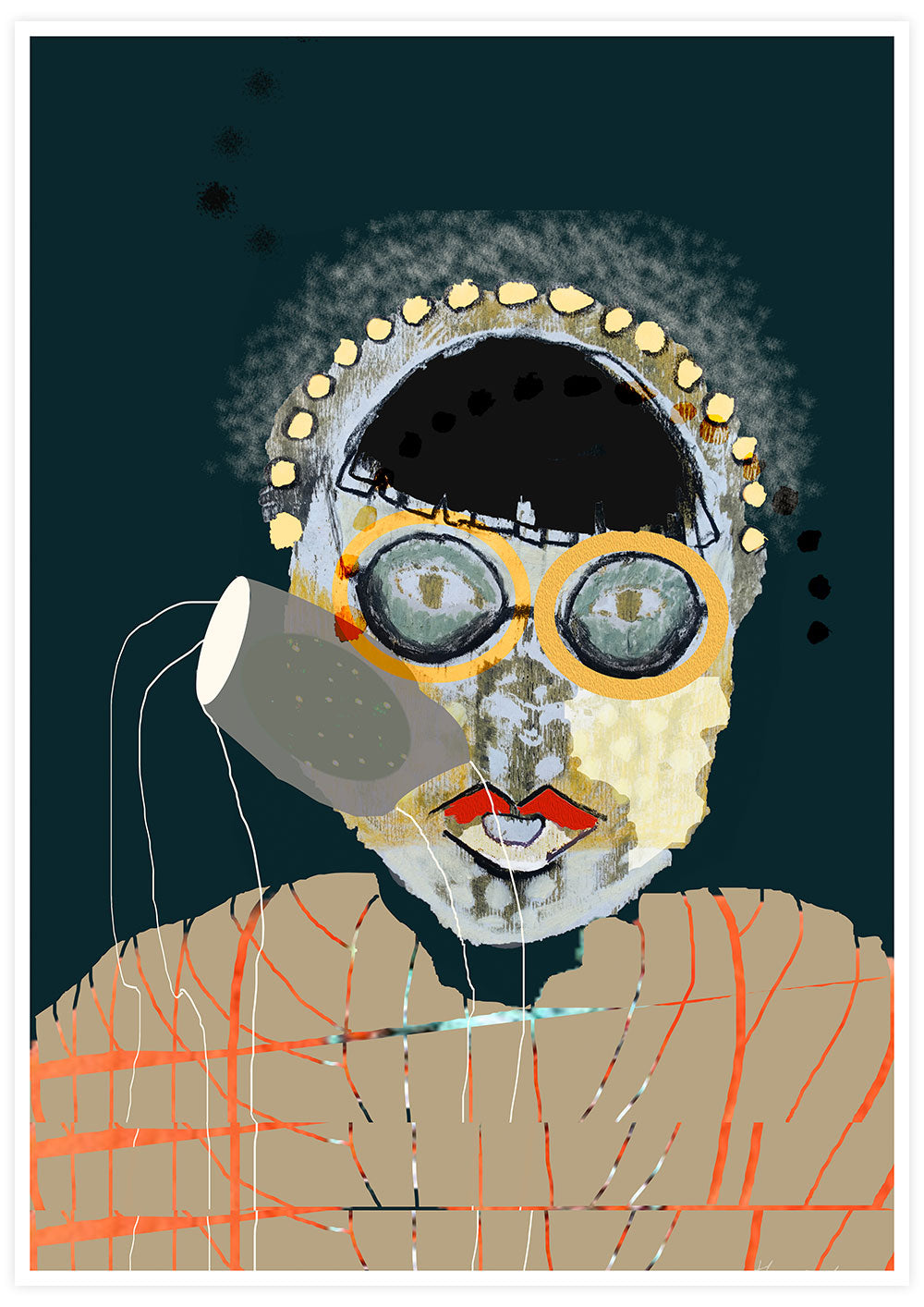 This art print is a mix of different processes. The face was created using the monoprint technique and further processed with oil pastels. The starting point was a drawing by Tsuguharu Foujita, which inspired me. The result is a great collage with deep colors, patterns and different layers with surprising effects.