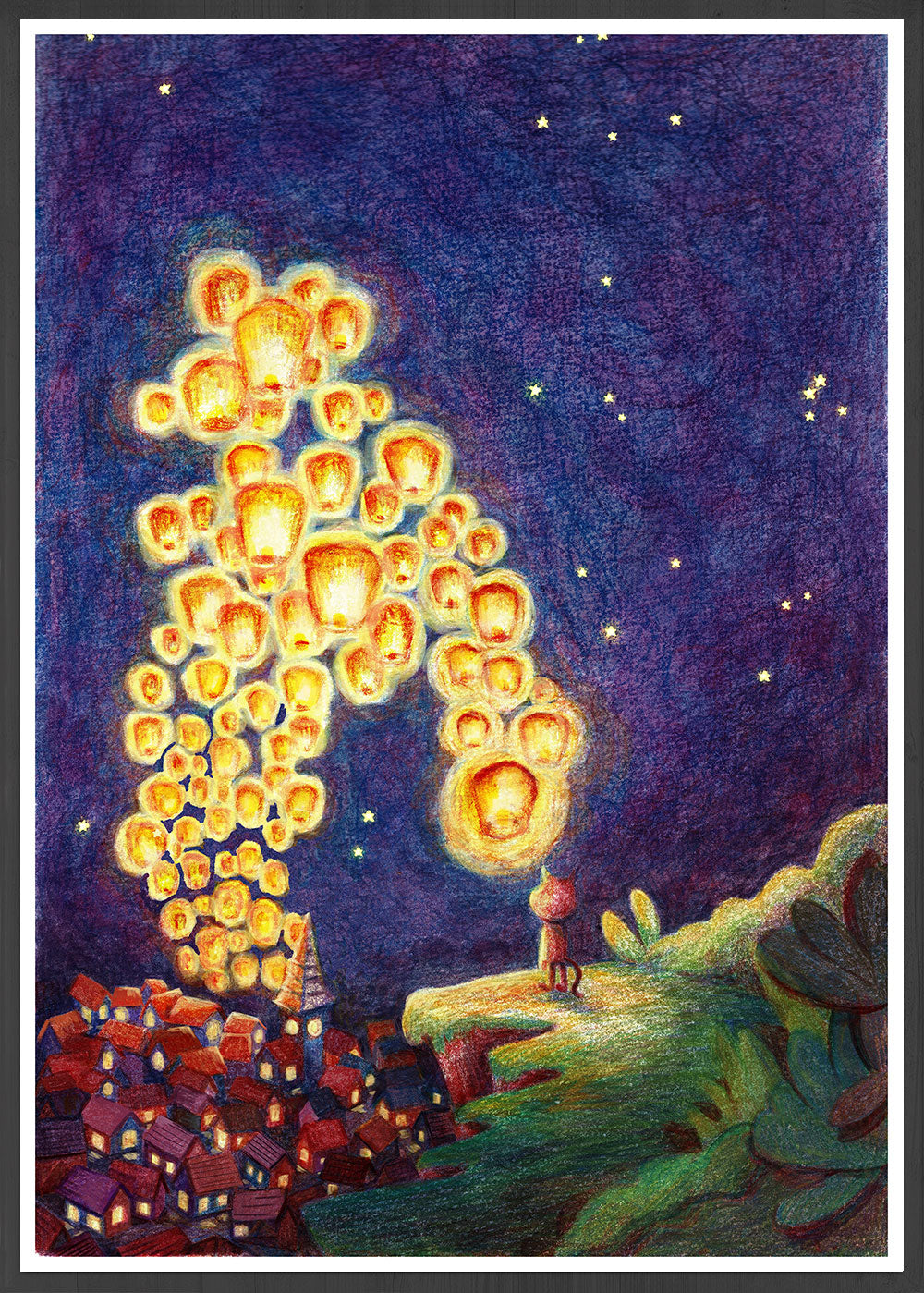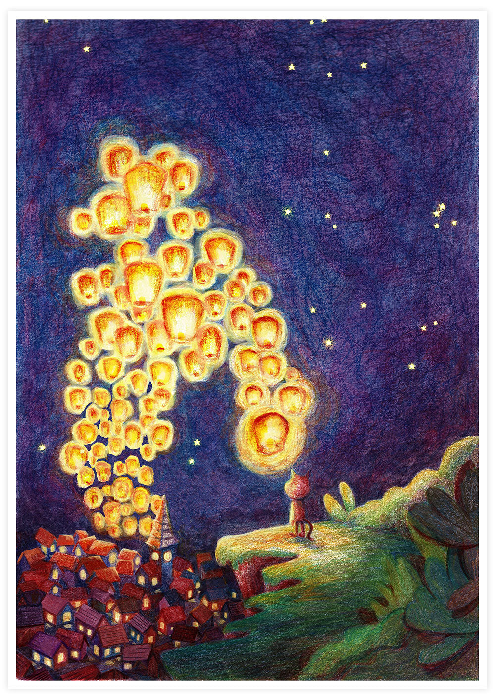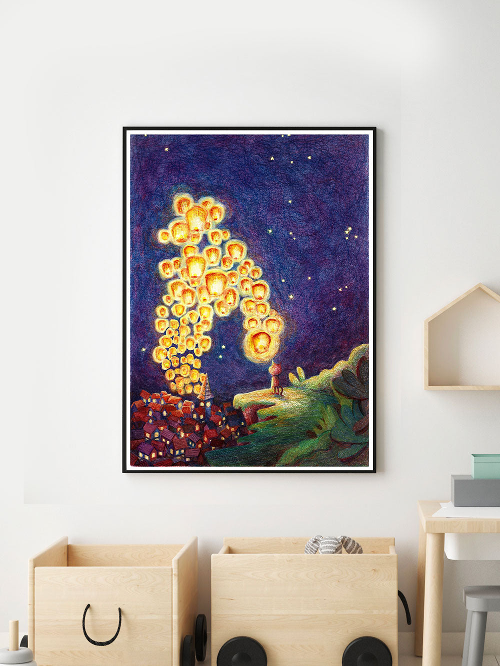 The Edge of the World Nursery Art Print by Shannon Bergin. What lies beyond the town where the lanterns visit at night? Watercolour, pencil and digital illustration.