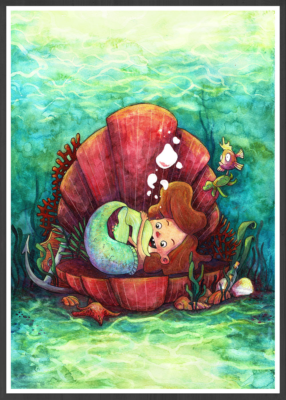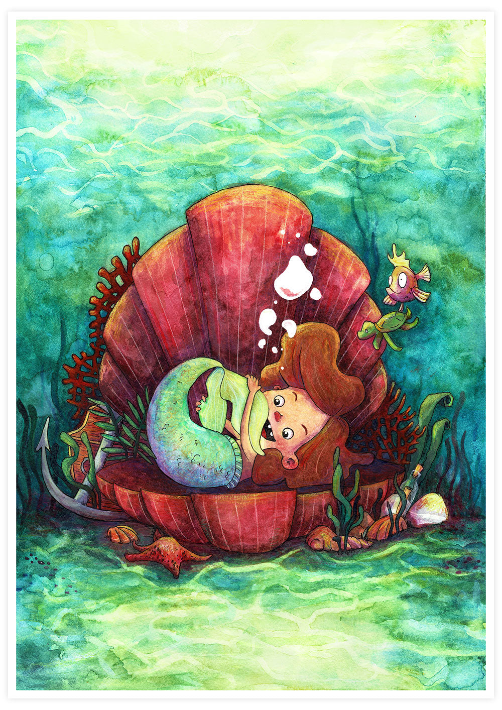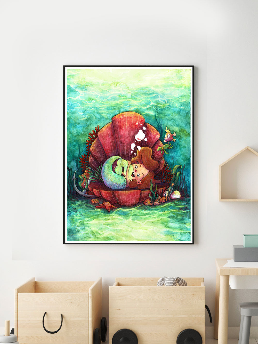 The Little-est Mermaid Art Print by Shannon Bergin. Watercolour and ink illustration of a baby mermaid discovering her fins.