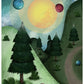 This digital print is a unique and eye-catching piece of art that will add a touch of whimsy and wonder to any room. The illustration features a strange cartoon-like land with rolling hills, big conifer trees, and bushes. Three ominous balls float in the sky, adding to the surreal and strange atmosphere of the image.