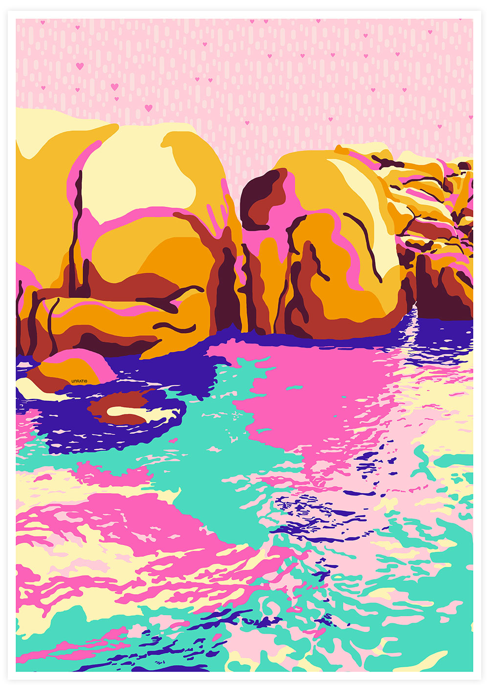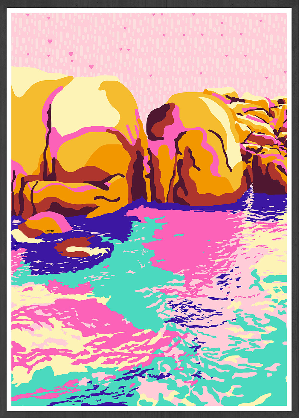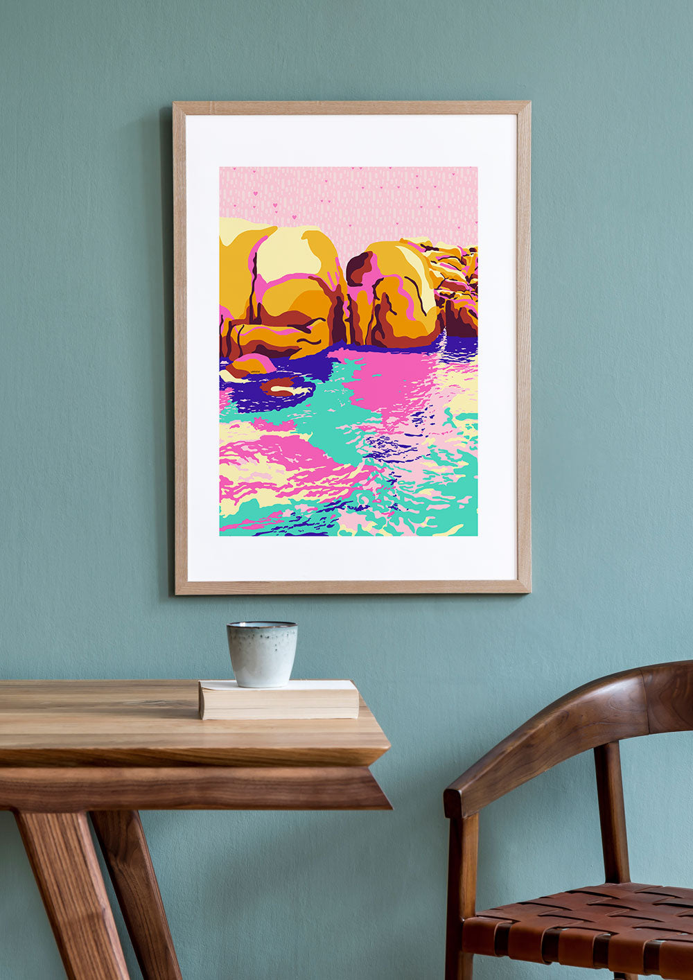 Immerse yourself in the tranquility of a sun-drenched cove with "Rockpool," a mesmerizing digital art print by Unratio. This serene piece portrays a dramatic coastline, where gentle waves lap against rugged rocks illuminated by warm sunlight. The calmness of the water contrasts with the textured surfaces of the rocks, creating a visually captivating scene.